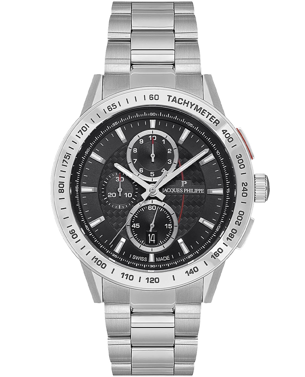 Швейцарские мужские часы-хронографХронографФункция позволяет измерять отрезки времени с особой точностью: часы, минуты, секунды. Верным признаком хронографа является наличие на циферблате 3 дополнительных окошек-счётчиков. с секундомеромСекундомерСекундоме́р — прибор, способный измерять интервалы времени с точностью до долей секунды. Jacques Philippe Globus JPQGC281316V2, кварцевый механизм с высокой точностью. Сапфировое стеклоСапфировое стеклоПрочный и надёжный материал из кристалла сапфира синтетического происхождения, характеризующийся особой твёрдостью и устойчивостью к царапинам и повреждениям. устойчивое к появлению царапин, обладающее высокой прозрачностью. Корпус часов изготовлен из нержавеющей стали. БезельБезельВнешний ободок, закрепляющий стекло. В спортивных часах так называется поворотное кольцо с делениями на циферблате, выполняет роль таймера – замеряет отрезки времени на шкале. Неподвижный безель – элемент декора. Однонаправленно вращающийся безель на дайверских часах позволяет фиксировать моменты погружения и выныривания на поверхность. из стали с тахиметромТахиметрРазмеченная шкала, располагается на ободке или безеле часов. Тахиметр позволяет рассчитать скорость на определённом участке пути, расстояние измеряется в километрах или милях.. На циферблате три дополнительных индикатора. Окошко даты находится в положении 6 часов. Стрелки с люминесцентным покрытиемЛюминесцентное покрытиеПозволяет считывать показания времени в темноте. Производители наносят на стрелки, часовые индексы, безель или поверхность циферблата светонакопительный состав, дающий холодное свечение.. Класс водозащиты: 100 метров, позволит плавать, нырять и заниматься другими водными видами спорта. Стальной браслет на застёжке «бабочка» с кнопкамиЗастёжка "бабочка"Такой вид застёжки дополняется предохранителями, помогающими избежать случайного раскрытия браслета. Обладают изящным исполнением. .
