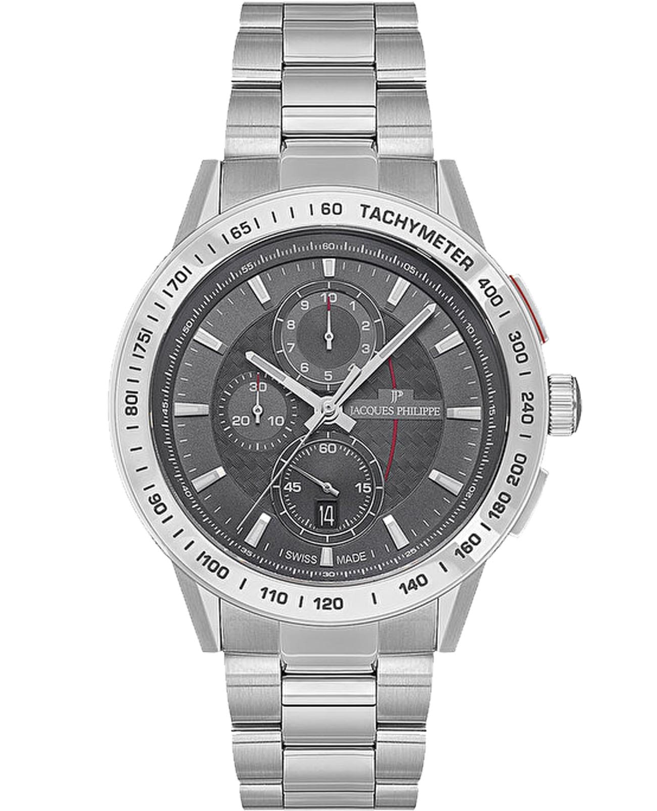 Швейцарские мужские часы-хронографХронографФункция позволяет измерять отрезки времени с особой точностью: часы, минуты, секунды. Верным признаком хронографа является наличие на циферблате 3 дополнительных окошек-счётчиков. с секундомеромСекундомерСекундоме́р — прибор, способный измерять интервалы времени с точностью до долей секунды. Jacques Philippe Globus JPQGC288347, кварцевый механизм с высокой точностью. Сапфировое стеклоСапфировое стеклоПрочный и надёжный материал из кристалла сапфира синтетического происхождения, характеризующийся особой твёрдостью и устойчивостью к царапинам и повреждениям. устойчивое к появлению царапин, обладающее высокой прозрачностью. Корпус часов изготовлен из нержавеющей стали. БезельБезельВнешний ободок, закрепляющий стекло. В спортивных часах так называется поворотное кольцо с делениями на циферблате, выполняет роль таймера – замеряет отрезки времени на шкале. Неподвижный безель – элемент декора. Однонаправленно вращающийся безель на дайверских часах позволяет фиксировать моменты погружения и выныривания на поверхность. из стали с тахиметромТахиметрРазмеченная шкала, располагается на ободке или безеле часов. Тахиметр позволяет рассчитать скорость на определённом участке пути, расстояние измеряется в километрах или милях.. На циферблате три дополнительных индикатора. Окошко даты находится в положении 6 часов. Стрелки с люминесцентным покрытиемЛюминесцентное покрытиеПозволяет считывать показания времени в темноте. Производители наносят на стрелки, часовые индексы, безель или поверхность циферблата светонакопительный состав, дающий холодное свечение.. Класс водозащиты: 100 метров, позволит плавать, нырять и заниматься другими водными видами спорта. Стальной браслет на застёжке «бабочка» с кнопкамиЗастёжка "бабочка"Такой вид застёжки дополняется предохранителями, помогающими избежать случайного раскрытия браслета. Обладают изящным исполнением. .