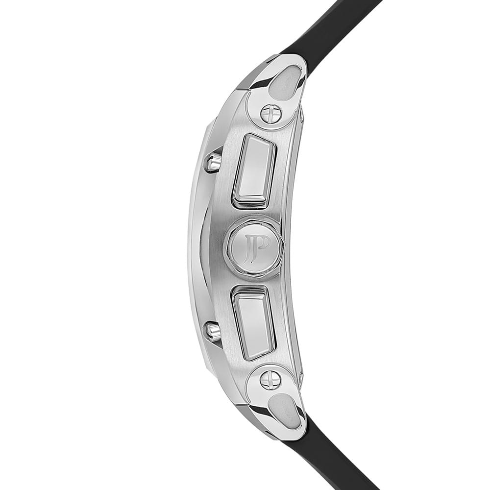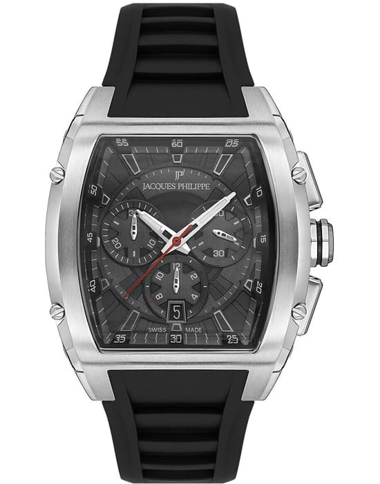 Швейцарские мужские часы-хронографХронографФункция позволяет измерять отрезки времени с особой точностью: часы, минуты, секунды. Верным признаком хронографа является наличие на циферблате 3 дополнительных окошек-счётчиков. с секундомеромСекундомерСекундоме́р — прибор, способный измерять интервалы времени с точностью до долей секунды. Jacques Philippe Quadro JPQGC461411, кварцевый механизм с высокой точностью. Сапфировое стеклоСапфировое стеклоПрочный и надёжный материал из кристалла сапфира синтетического происхождения, характеризующийся особой твёрдостью и устойчивостью к царапинам и повреждениям. устойчивое к появлению царапин, обладающее высокой прозрачностью. Корпус часов изготовлен из нержавеющей стали. На циферблате три дополнительных индикатора. Окошко даты находится в положении 6 часов. Стрелки с люминесцентным покрытиемЛюминесцентное покрытиеПозволяет считывать показания времени в темноте. Производители наносят на стрелки, часовые индексы, безель или поверхность циферблата светонакопительный состав, дающий холодное свечение.. Класс водозащиты: 50 метров, позволит защитить корпус от случайных брызг или капель дождя. Стальной браслет на застёжке «бабочка» с кнопкамиЗастёжка "бабочка"Такой вид застёжки дополняется предохранителями, помогающими избежать случайного раскрытия браслета. Обладают изящным исполнением. .