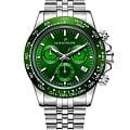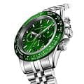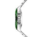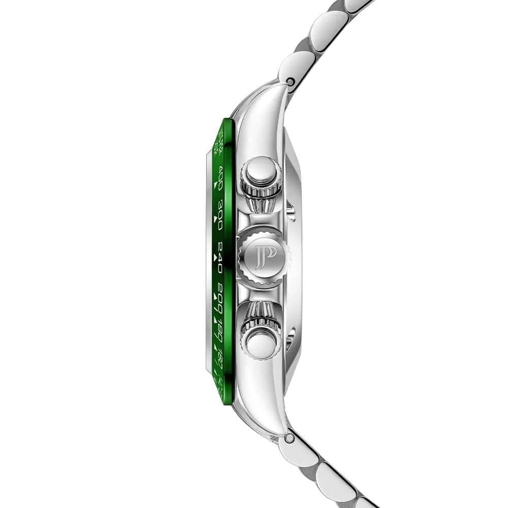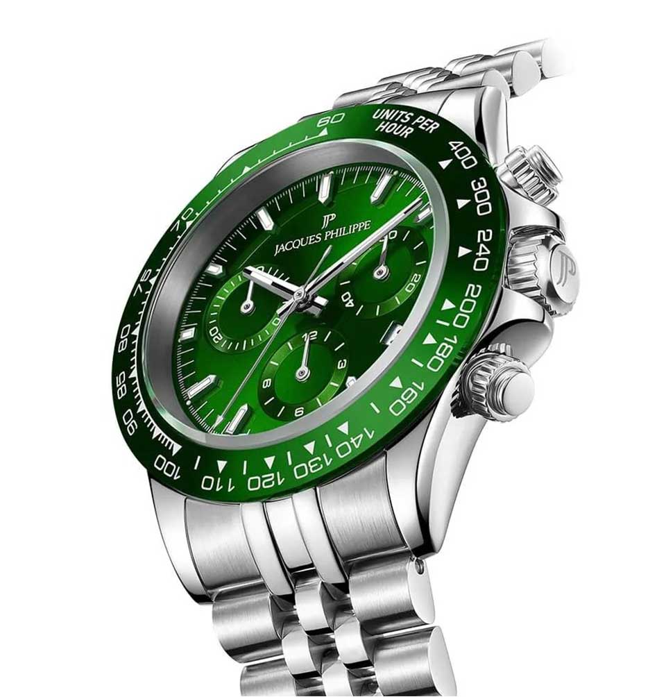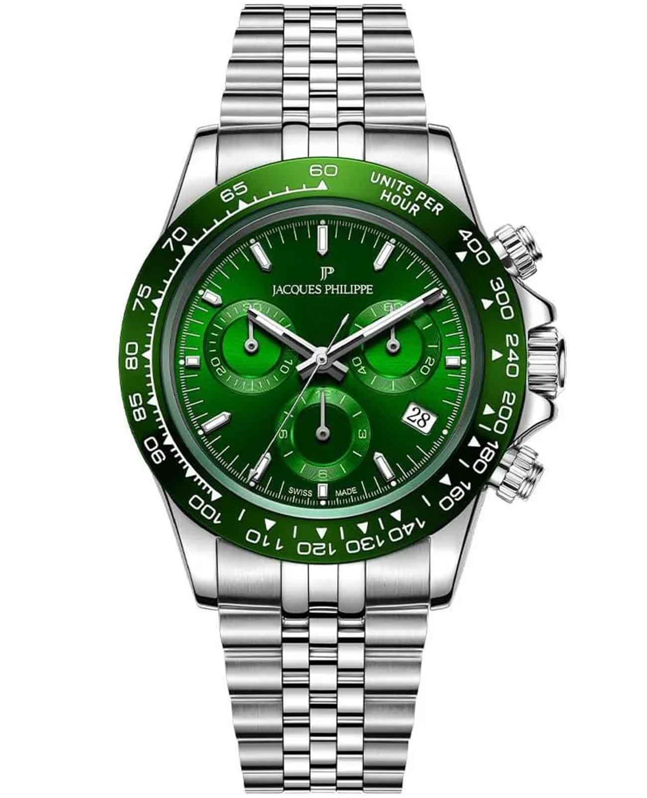 Швейцарские наручные часы Jacques Philippe JPQGC7113X6SBG сочетают в себе современный дизайн, надежность и функциональность, это стильные швейцарские часы с функцией хронографаХронографФункция позволяет измерять отрезки времени с особой точностью: часы, минуты, секунды. Верным признаком хронографа является наличие на циферблате 3 дополнительных окошек-счётчиков. и секундомераСекундомерСекундоме́р — прибор, способный измерять интервалы времени с точностью до долей секунды.. Корпус круглой формы диаметром 39 мм выполнен из прочной нержавеющей стали, а безельБезельВнешний ободок, закрепляющий стекло. В спортивных часах так называется поворотное кольцо с делениями на циферблате, выполняет роль таймера – замеряет отрезки времени на шкале. Неподвижный безель – элемент декора. Однонаправленно вращающийся безель на дайверских часах позволяет фиксировать моменты погружения и выныривания на поверхность. с элегантным зеленым IP-покрытиемIP-покрытиеМетод ионного напыления. Демонстрирует повышенную устойчивость к истиранию, окислению и химическим веществам. Под воздействием высокого давления и температуры около 1500°C молекулы металла надёжно соединяются с частицами корпуса часов., а сапфировое стеклоСапфировое стеклоПрочный и надёжный материал из кристалла сапфира синтетического происхождения, характеризующийся особой твёрдостью и устойчивостью к царапинам и повреждениям. надежно защищает зеленый циферблат от царапин и повреждений. Модель оснащена точным кварцевым механизмом RONDA 5030.D-4H, а также дополнительными функциями — тахиметромТахиметрРазмеченная шкала, располагается на ободке или безеле часов. Тахиметр позволяет рассчитать скорость на определённом участке пути, расстояние измеряется в километрах или милях. и индикатором даты, что делает часы не только стильным аксессуаром, но и практичным помощником на каждый день. Серебристый браслет шириной 20 мм удобно фиксируется на запястье с помощью застежки «бабочка»Застёжка "бабочка"Такой вид застёжки дополняется предохранителями, помогающими избежать случайного раскрытия браслета. Обладают изящным исполнением. . Стрелки имеют люминесцентное покрытиеЛюминесцентное покрытиеПозволяет считывать показания времени в темноте. Производители наносят на стрелки, часовые индексы, безель или поверхность циферблата светонакопительный состав, дающий холодное свечение. для удобства чтения времени в темноте. Водозащита 5 АТМ позволяет не снимать часы при дожде и случайных контактах с водой.