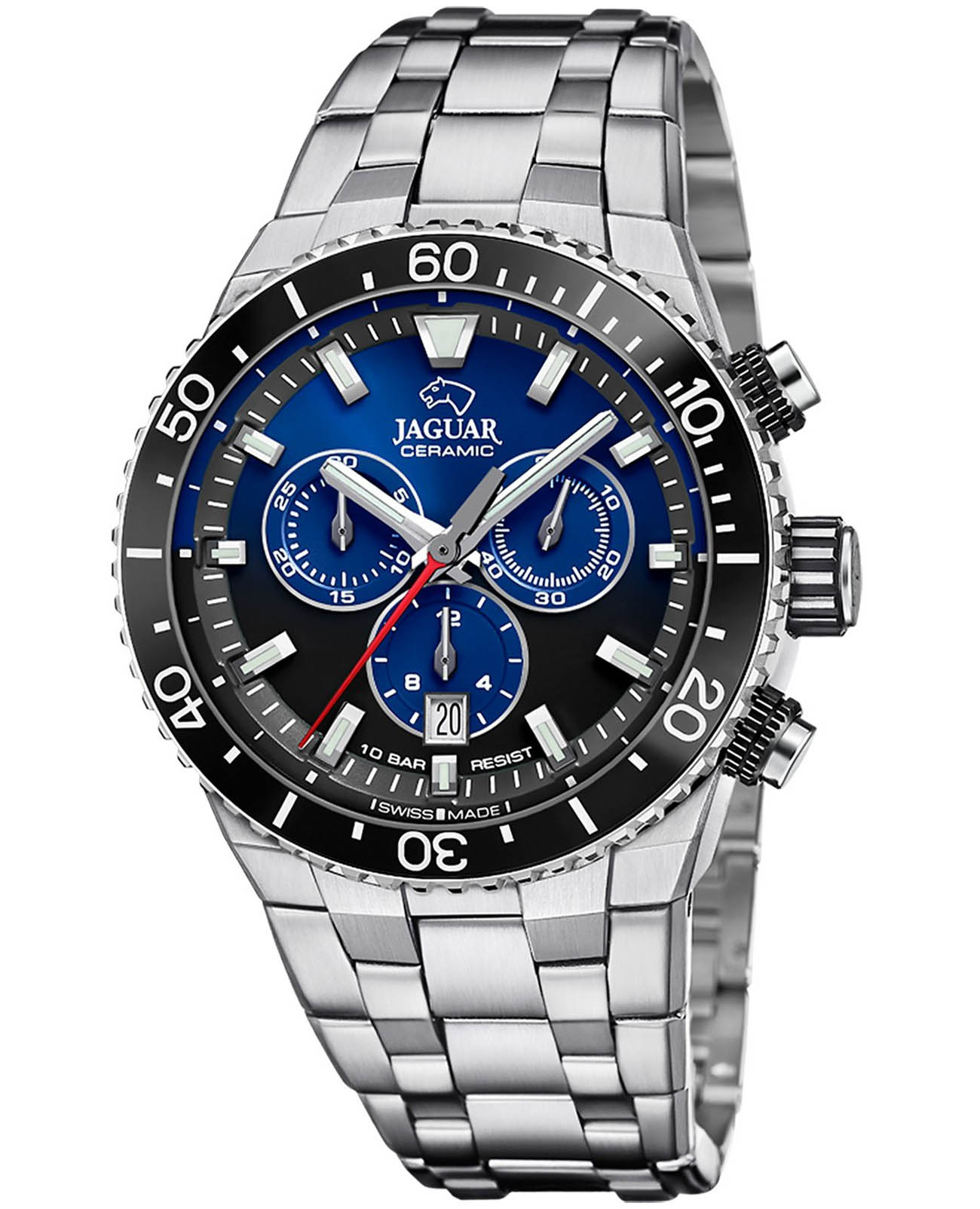 Мужские швейцарские часы-хронографХронографФункция позволяет измерять отрезки времени с особой точностью: часы, минуты, секунды. Верным признаком хронографа является наличие на циферблате 3 дополнительных окошек-счётчиков. Jaguar Ceramic J1022/5. Кварцевый швейцарский калибр Ronda 5030d. Сапфировое стеклоСапфировое стеклоПрочный и надёжный материал из кристалла сапфира синтетического происхождения, характеризующийся особой твёрдостью и устойчивостью к царапинам и повреждениям. устойчивое к мелким механическим повреждениям. Корпус часов изготовлен из нержавеющей стали. Стрелки и метки с люминесцентным покрытиемЛюминесцентное покрытиеПозволяет считывать показания времени в темноте. Производители наносят на стрелки, часовые индексы, безель или поверхность циферблата светонакопительный состав, дающий холодное свечение.. Окошко даты находится в положении 6 часов. Класс водозащиты: 100 метров, позволит плавать, нырять и заниматься другими водными видами спорта. БезельБезельВнешний ободок, закрепляющий стекло. В спортивных часах так называется поворотное кольцо с делениями на циферблате, выполняет роль таймера – замеряет отрезки времени на шкале. Неподвижный безель – элемент декора. Однонаправленно вращающийся безель на дайверских часах позволяет фиксировать моменты погружения и выныривания на поверхность. из высокотехнологичной керамикиВысокотехнологичная керамикаИнновационный запатентованный Rado материал с гладкой или матовой поверхностью. Керамика за счёт кристаллической структуры обладает повышенной устойчивостью от возникновения царапин. Материал способен принимать температуру тела человека, обеспечивая невероятный комфорт при ношении.. Стальной браслет на раскладной застёжкеРаскладная застёжкаТакой тип застёжки используется только на браслетах из металла. Она никогда не раскрывается полностью, происходит разделение на 2 и более частей. Раскладывающая застёжка снизит вероятность потери часов к минимуму..