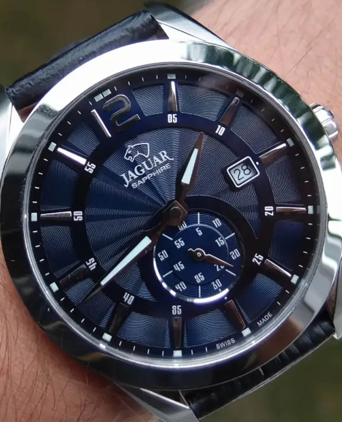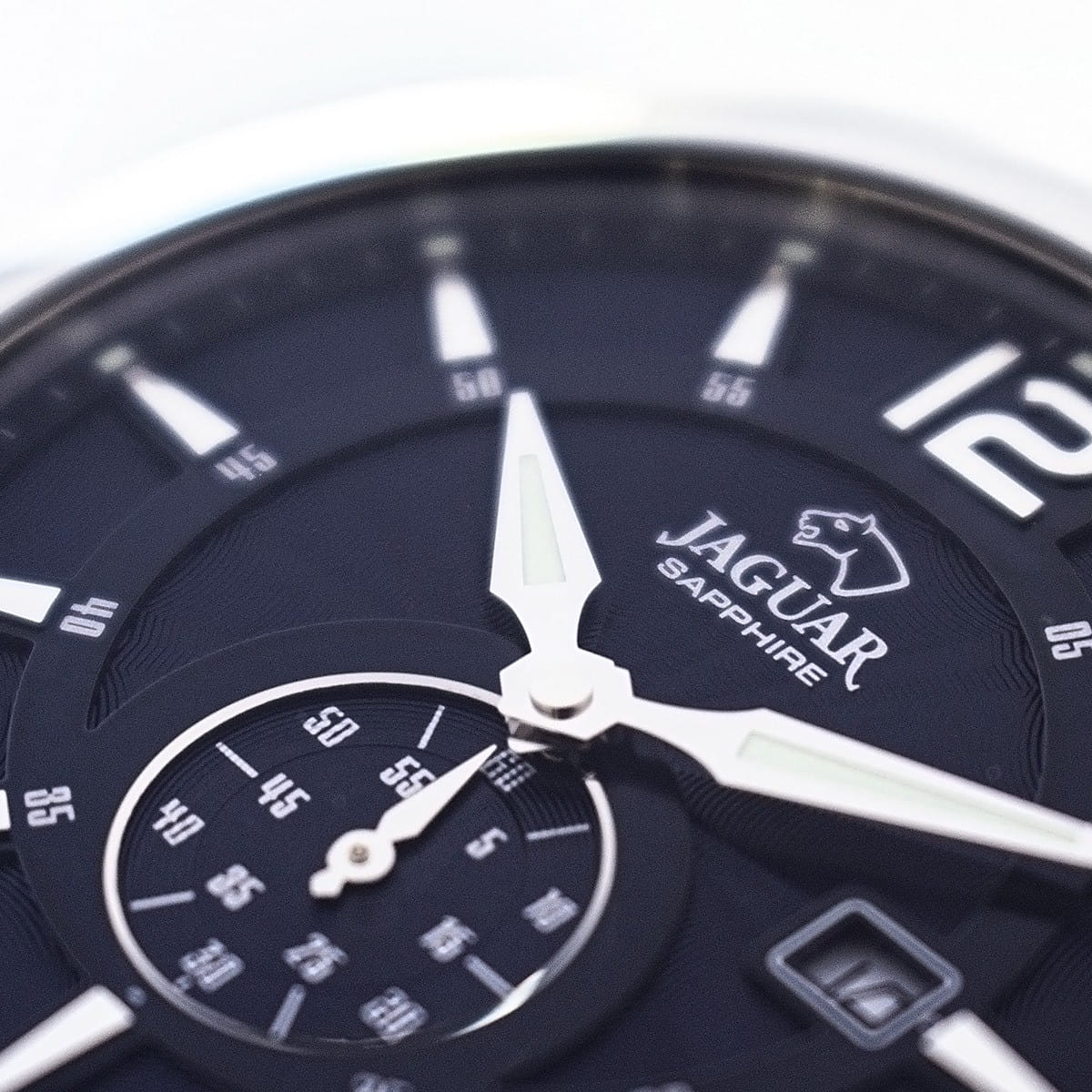 Мужские швейцарские часы Jaguar Acamar J663/2. Кварцевый швейцарский калибр RONDA 6004D. Сапфировое стеклоСапфировое стеклоПрочный и надёжный материал из кристалла сапфира синтетического происхождения, характеризующийся особой твёрдостью и устойчивостью к царапинам и повреждениям. устойчивое к мелким механическим повреждениям. Корпус часов изготовлен из нержавеющей стали. Стрелки и метки с люминесцентным покрытиемЛюминесцентное покрытиеПозволяет считывать показания времени в темноте. Производители наносят на стрелки, часовые индексы, безель или поверхность циферблата светонакопительный состав, дающий холодное свечение.. Окошко даты находится в положении 3 часа. Класс водозащиты: 100 метров, позволит плавать, нырять и заниматься другими водными видами спорта. Кожаный ремешок на стандартной застёжке.