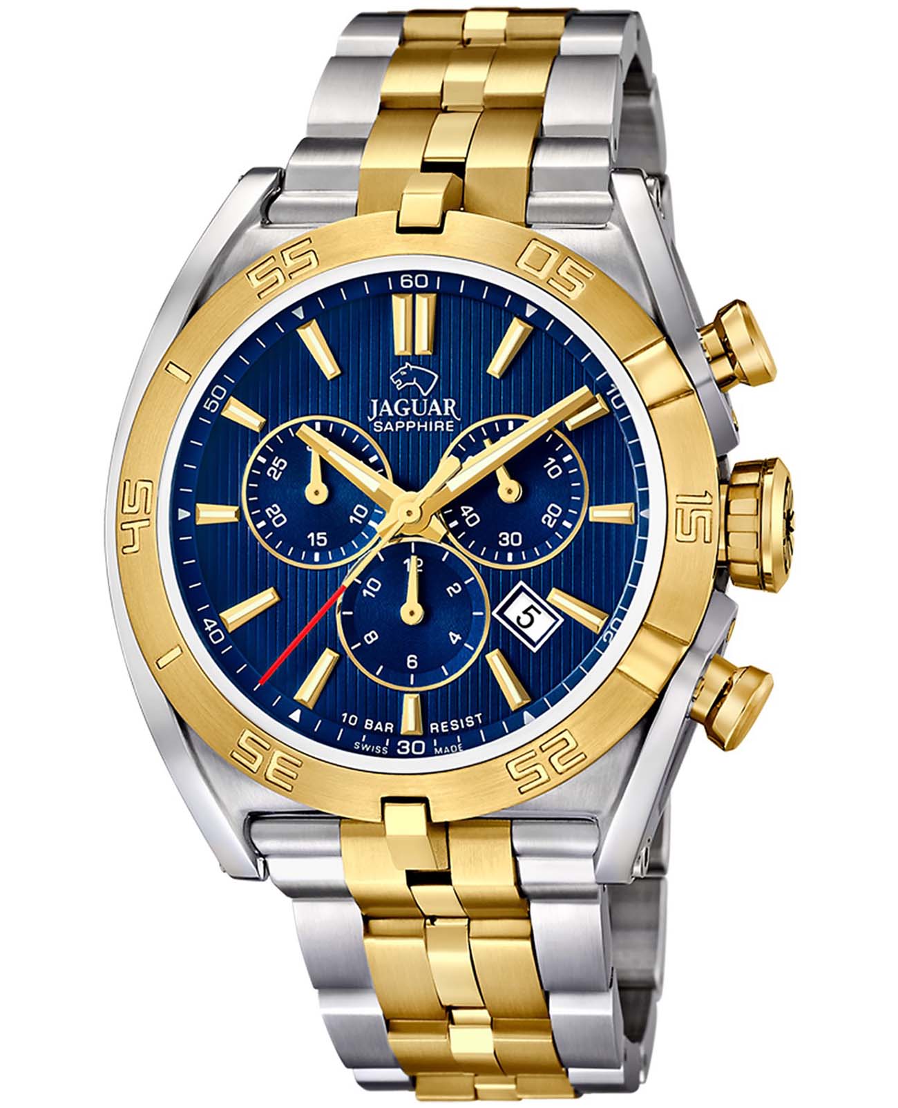 Мужские швейцарские часы-хронографХронографФункция позволяет измерять отрезки времени с особой точностью: часы, минуты, секунды. Верным признаком хронографа является наличие на циферблате 3 дополнительных окошек-счётчиков. Jaguar Executive J855/A. Кварцевый швейцарский калибр Ronda 5030d. Сапфировое стеклоСапфировое стеклоПрочный и надёжный материал из кристалла сапфира синтетического происхождения, характеризующийся особой твёрдостью и устойчивостью к царапинам и повреждениям. устойчивое к мелким механическим повреждениям. Корпус и браслет часов изготовлены из нержавеющей стали. Стрелки и метки с люминесцентным покрытиемЛюминесцентное покрытиеПозволяет считывать показания времени в темноте. Производители наносят на стрелки, часовые индексы, безель или поверхность циферблата светонакопительный состав, дающий холодное свечение.. Окошко даты находится в положении между «4» и «5 часами». Класс водозащиты: 100 метров, позволит плавать, нырять и заниматься другими водными видами спорта. Стальной браслет с частичным PVD-покрытиемPVDУльтратонкое покрытие наносится в технике вакуумного напыления, сочетает в себе нитрид титана особой прочности со слоем золота или оксида хрома. Несёт в себе декоративную или защитную функцию. на раскладной застёжкеРаскладная застёжкаТакой тип застёжки используется только на браслетах из металла. Она никогда не раскрывается полностью, происходит разделение на 2 и более частей. Раскладывающая застёжка снизит вероятность потери часов к минимуму.. БезельБезельВнешний ободок, закрепляющий стекло. В спортивных часах так называется поворотное кольцо с делениями на циферблате, выполняет роль таймера – замеряет отрезки времени на шкале. Неподвижный безель – элемент декора. Однонаправленно вращающийся безель на дайверских часах позволяет фиксировать моменты погружения и выныривания на поверхность. с PVD-покрытиемPVDУльтратонкое покрытие наносится в технике вакуумного напыления, сочетает в себе нитрид титана особой прочности со слоем золота или оксида хрома. Несёт в себе декоративную или защитную функцию..