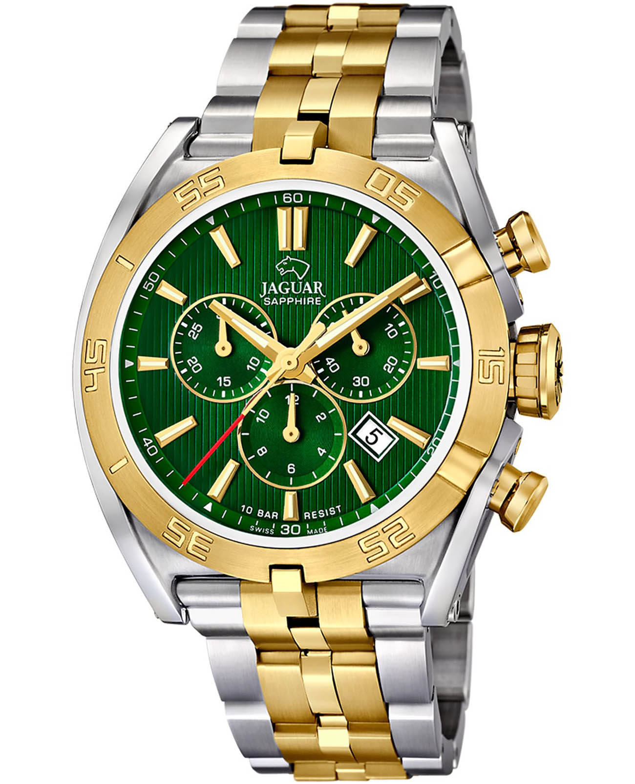 Мужские швейцарские часы-хронографХронографФункция позволяет измерять отрезки времени с особой точностью: часы, минуты, секунды. Верным признаком хронографа является наличие на циферблате 3 дополнительных окошек-счётчиков. Jaguar Executive J855/B. Кварцевый швейцарский калибр Ronda 5030d. Сапфировое стеклоСапфировое стеклоПрочный и надёжный материал из кристалла сапфира синтетического происхождения, характеризующийся особой твёрдостью и устойчивостью к царапинам и повреждениям. устойчивое к мелким механическим повреждениям. Корпус и браслет часов изготовлены из нержавеющей стали. Стрелки и метки с люминесцентным покрытиемЛюминесцентное покрытиеПозволяет считывать показания времени в темноте. Производители наносят на стрелки, часовые индексы, безель или поверхность циферблата светонакопительный состав, дающий холодное свечение.. Окошко даты находится в положении между «4» и «5 часами». Класс водозащиты: 100 метров, позволит плавать, нырять и заниматься другими водными видами спорта. Стальной браслет с частичным PVD-покрытиемPVDУльтратонкое покрытие наносится в технике вакуумного напыления, сочетает в себе нитрид титана особой прочности со слоем золота или оксида хрома. Несёт в себе декоративную или защитную функцию. на раскладной застёжкеРаскладная застёжкаТакой тип застёжки используется только на браслетах из металла. Она никогда не раскрывается полностью, происходит разделение на 2 и более частей. Раскладывающая застёжка снизит вероятность потери часов к минимуму.. БезельБезельВнешний ободок, закрепляющий стекло. В спортивных часах так называется поворотное кольцо с делениями на циферблате, выполняет роль таймера – замеряет отрезки времени на шкале. Неподвижный безель – элемент декора. Однонаправленно вращающийся безель на дайверских часах позволяет фиксировать моменты погружения и выныривания на поверхность. с PVD-покрытиемPVDУльтратонкое покрытие наносится в технике вакуумного напыления, сочетает в себе нитрид титана особой прочности со слоем золота или оксида хрома. Несёт в себе декоративную или защитную функцию..