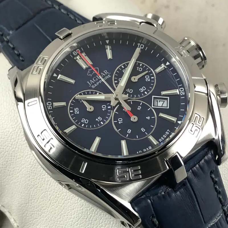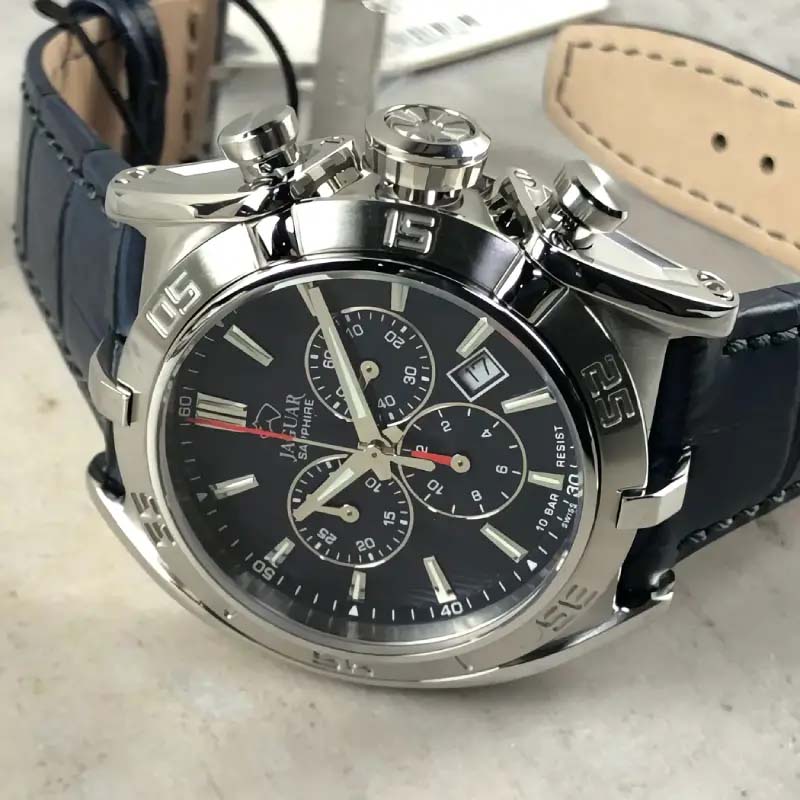 Мужские швейцарские часы-хронографХронографФункция позволяет измерять отрезки времени с особой точностью: часы, минуты, секунды. Верным признаком хронографа является наличие на циферблате 3 дополнительных окошек-счётчиков. Jaguar Executive Chrono J857/B. Кварцевый швейцарский калибр Ronda 5030d. Сапфировое стеклоСапфировое стеклоПрочный и надёжный материал из кристалла сапфира синтетического происхождения, характеризующийся особой твёрдостью и устойчивостью к царапинам и повреждениям. устойчивое к мелким механическим повреждениям. Корпус и браслет часов изготовлены из нержавеющей стали. Стрелки и метки с люминесцентным покрытиемЛюминесцентное покрытиеПозволяет считывать показания времени в темноте. Производители наносят на стрелки, часовые индексы, безель или поверхность циферблата светонакопительный состав, дающий холодное свечение.. Окошко даты находится в положении между «4» и «5 часами». Класс водозащиты: 100 метров, позволит плавать, нырять и заниматься другими водными видами спорта. Кожаный ремешок на стандартной застёжке.