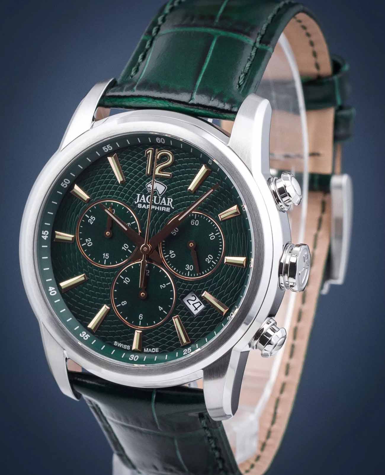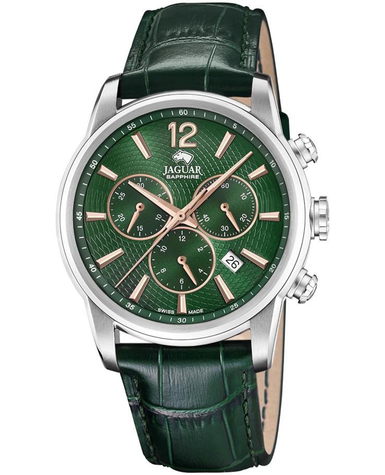 Мужские швейцарские часы-хронографХронографФункция позволяет измерять отрезки времени с особой точностью: часы, минуты, секунды. Верным признаком хронографа является наличие на циферблате 3 дополнительных окошек-счётчиков. Jaguar Acamar J968/3. Кварцевый швейцарский калибр RONDA 5030D. Сапфировое стеклоСапфировое стеклоПрочный и надёжный материал из кристалла сапфира синтетического происхождения, характеризующийся особой твёрдостью и устойчивостью к царапинам и повреждениям. устойчивое к мелким механическим повреждениям. Корпус часов изготовлен из нержавеющей стали. Окошко даты находится в положении между 4 и 5 часов. Класс водозащиты: 50 метров, позволит защитить корпус от случайных брызг или капель дождя. Кожаный ремешок на стандартной застёжке. Стрелки и метки с люминесцентным покрытиемЛюминесцентное покрытиеПозволяет считывать показания времени в темноте. Производители наносят на стрелки, часовые индексы, безель или поверхность циферблата светонакопительный состав, дающий холодное свечение..