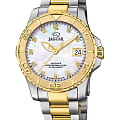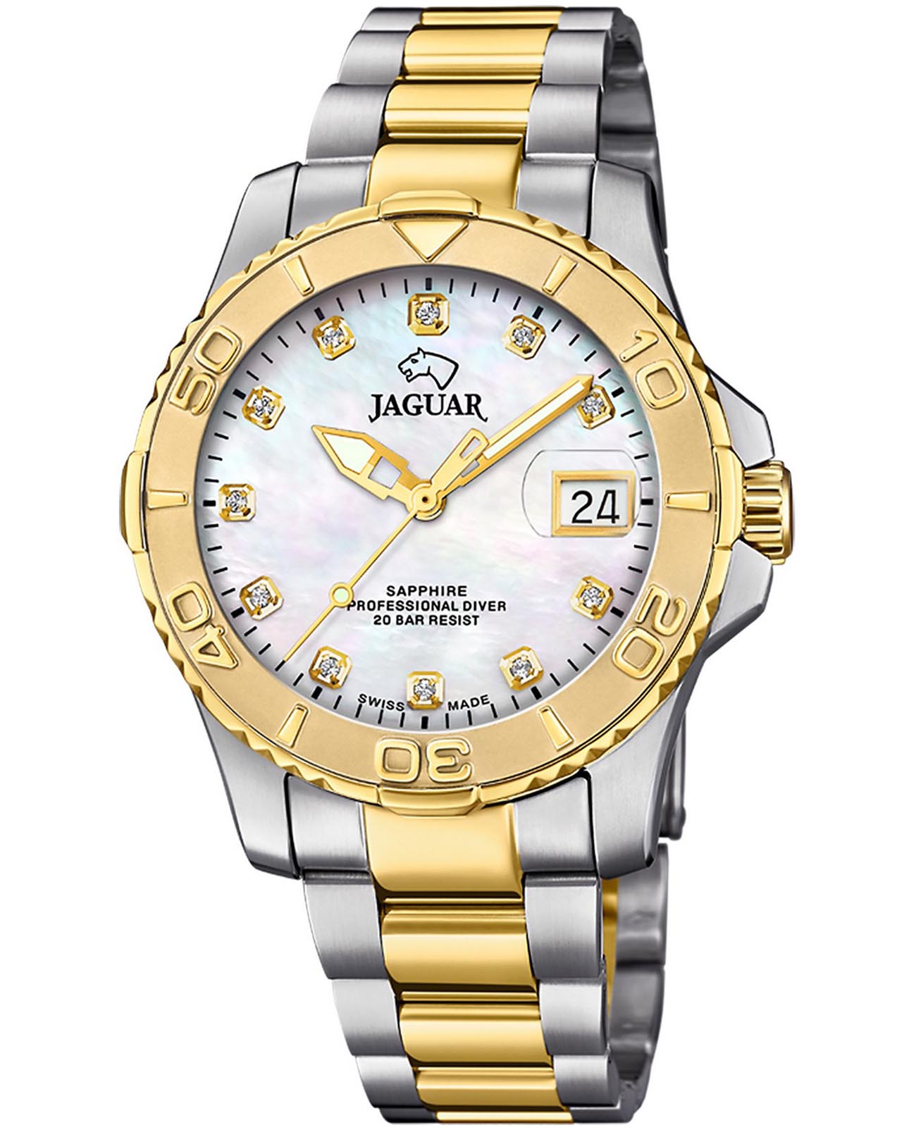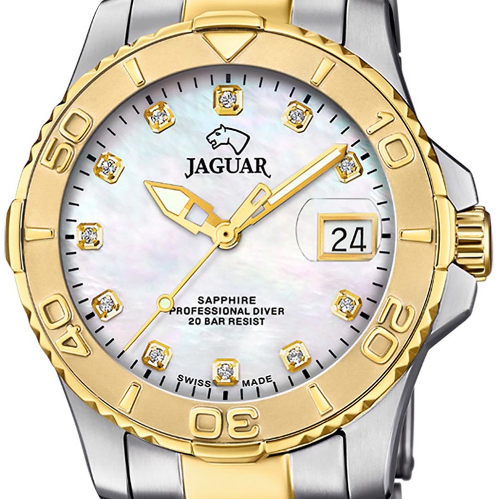 Женские швейцарские часы Jaguar Couple Diver J970/4. Кварцевый швейцарский калибр Ronda 6003.d. Сапфировое стеклоСапфировое стеклоПрочный и надёжный материал из кристалла сапфира синтетического происхождения, характеризующийся особой твёрдостью и устойчивостью к царапинам и повреждениям. устойчивое к мелким механическим повреждениям. Корпус часов изготовлен из нержавеющей стали. Циферблат декорирован вставками из циркония на метках времени. Стрелки и метки с люминесцентным покрытиемЛюминесцентное покрытиеПозволяет считывать показания времени в темноте. Производители наносят на стрелки, часовые индексы, безель или поверхность циферблата светонакопительный состав, дающий холодное свечение.. Окошко даты находится в положении 3 часа. Класс водозащиты: 200 метров, позволит плавать, нырять и заниматься другими водными видами спорта. Стальной браслет с частичным  PVD-покрытиемPVDУльтратонкое покрытие наносится в технике вакуумного напыления, сочетает в себе нитрид титана особой прочности со слоем золота или оксида хрома. Несёт в себе декоративную или защитную функцию. на раскладной застёжкеРаскладная застёжкаТакой тип застёжки используется только на браслетах из металла. Она никогда не раскрывается полностью, происходит разделение на 2 и более частей. Раскладывающая застёжка снизит вероятность потери часов к минимуму.. БезельБезельВнешний ободок, закрепляющий стекло. В спортивных часах так называется поворотное кольцо с делениями на циферблате, выполняет роль таймера – замеряет отрезки времени на шкале. Неподвижный безель – элемент декора. Однонаправленно вращающийся безель на дайверских часах позволяет фиксировать моменты погружения и выныривания на поверхность. с PVD-покрытиемPVDУльтратонкое покрытие наносится в технике вакуумного напыления, сочетает в себе нитрид титана особой прочности со слоем золота или оксида хрома. Несёт в себе декоративную или защитную функцию..