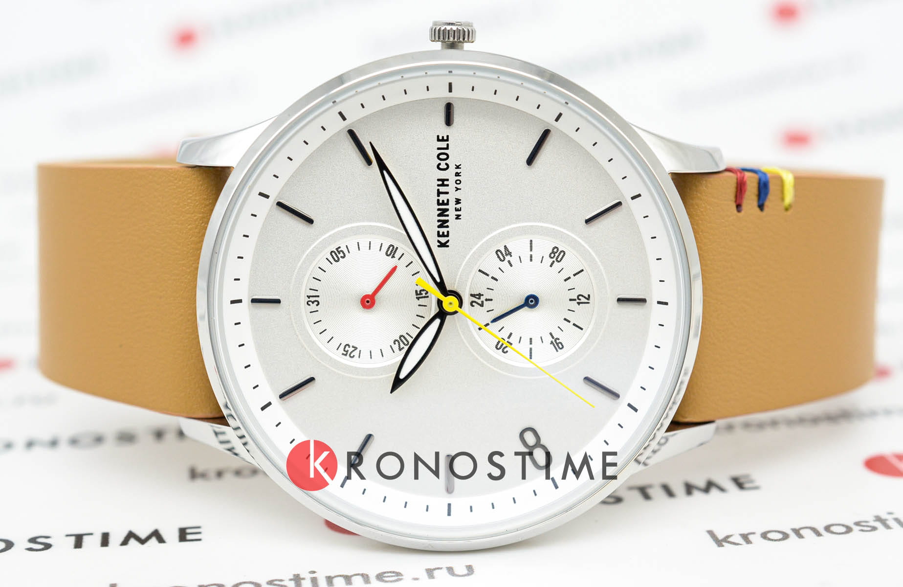 Мужские кварцевые часы с минеральным стекломМинеральное стеклоМинеральное стекло представляет собой искусственно выращенный минерал кварца. Такое стекло отличается особой устойчивостью к повреждениям и царапинам. Уступает по некоторым качествам сапфировому стеклу. Kenneth Cole Classic KCWGF2233401, кварцевый механизм с высокой точностью. Класс водозащиты: 30 метров, позволит защитить корпус от случайных брызг или капель дождя. Корпус часов изготовлен из стали. Кожаный ремешок на стандартной застёжке. Отображение даты в малом циферблате. 12/24х часовой формат времени. Стрелки с люминесцентным покрытиемЛюминесцентное покрытиеПозволяет считывать показания времени в темноте. Производители наносят на стрелки, часовые индексы, безель или поверхность циферблата светонакопительный состав, дающий холодное свечение..