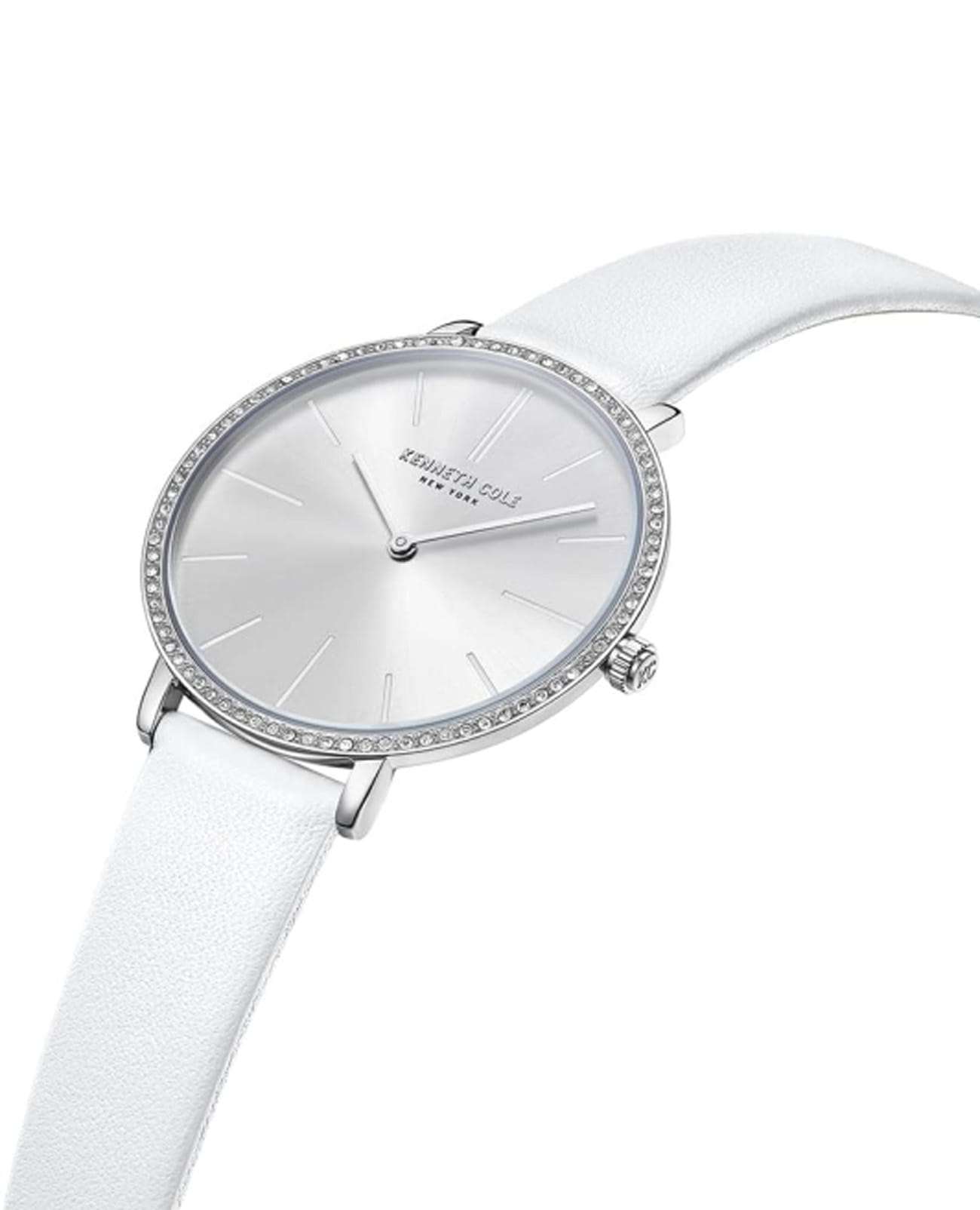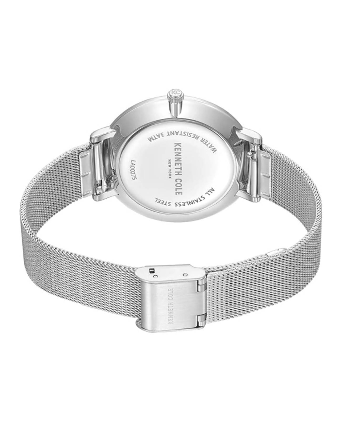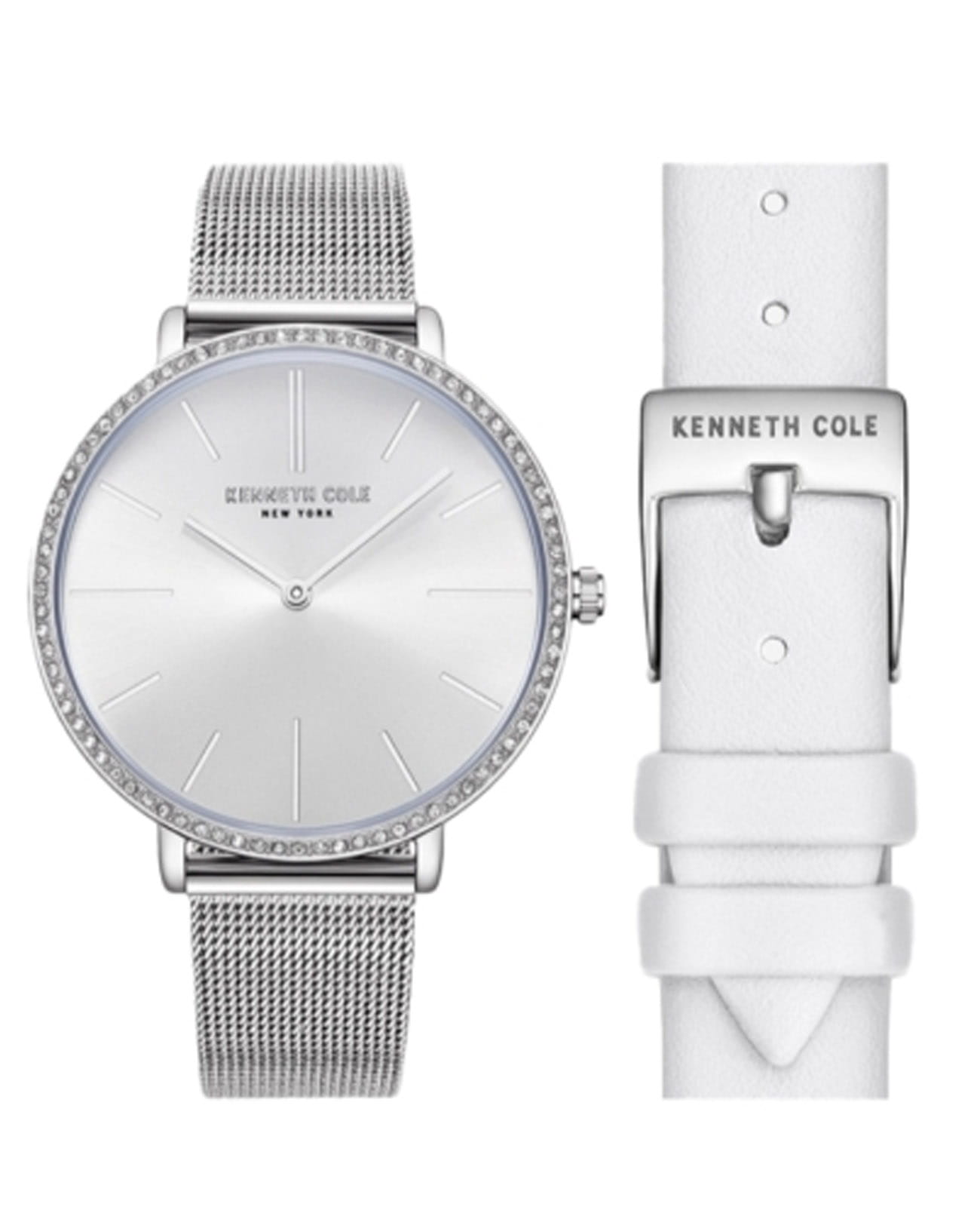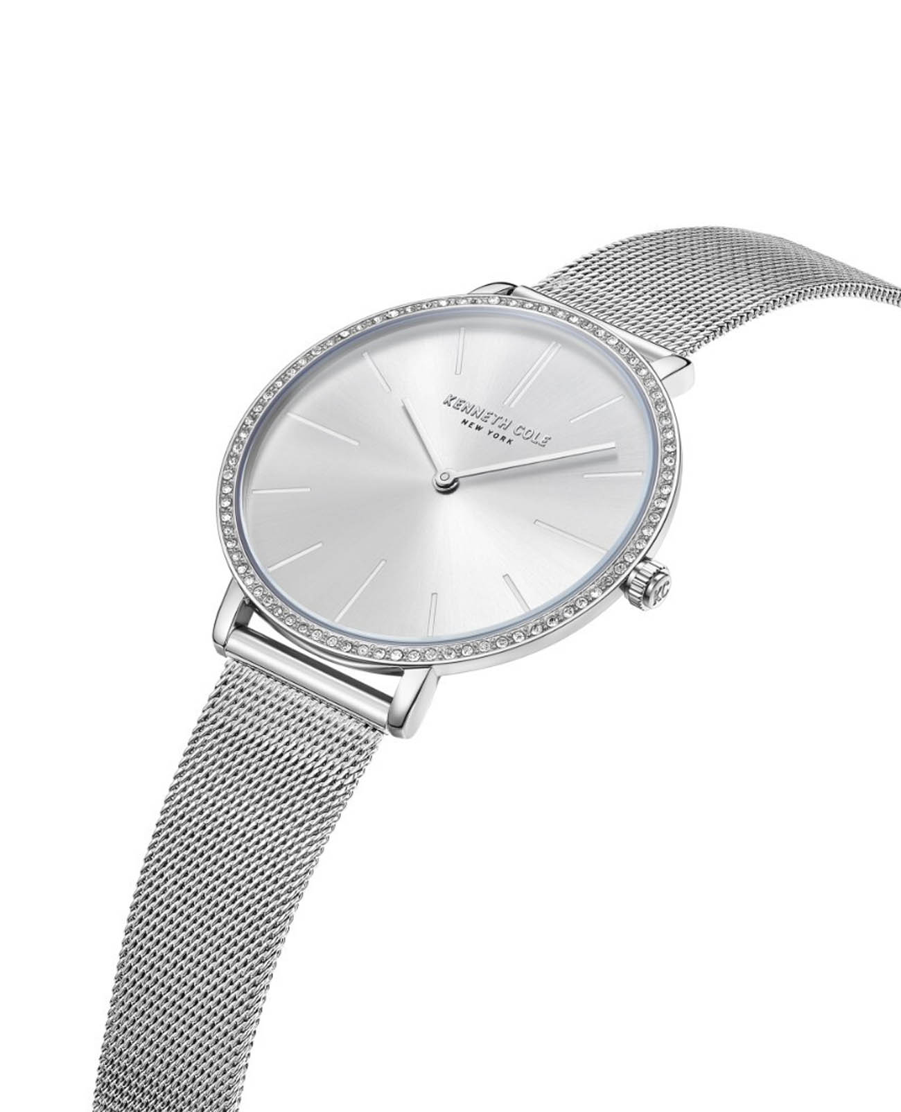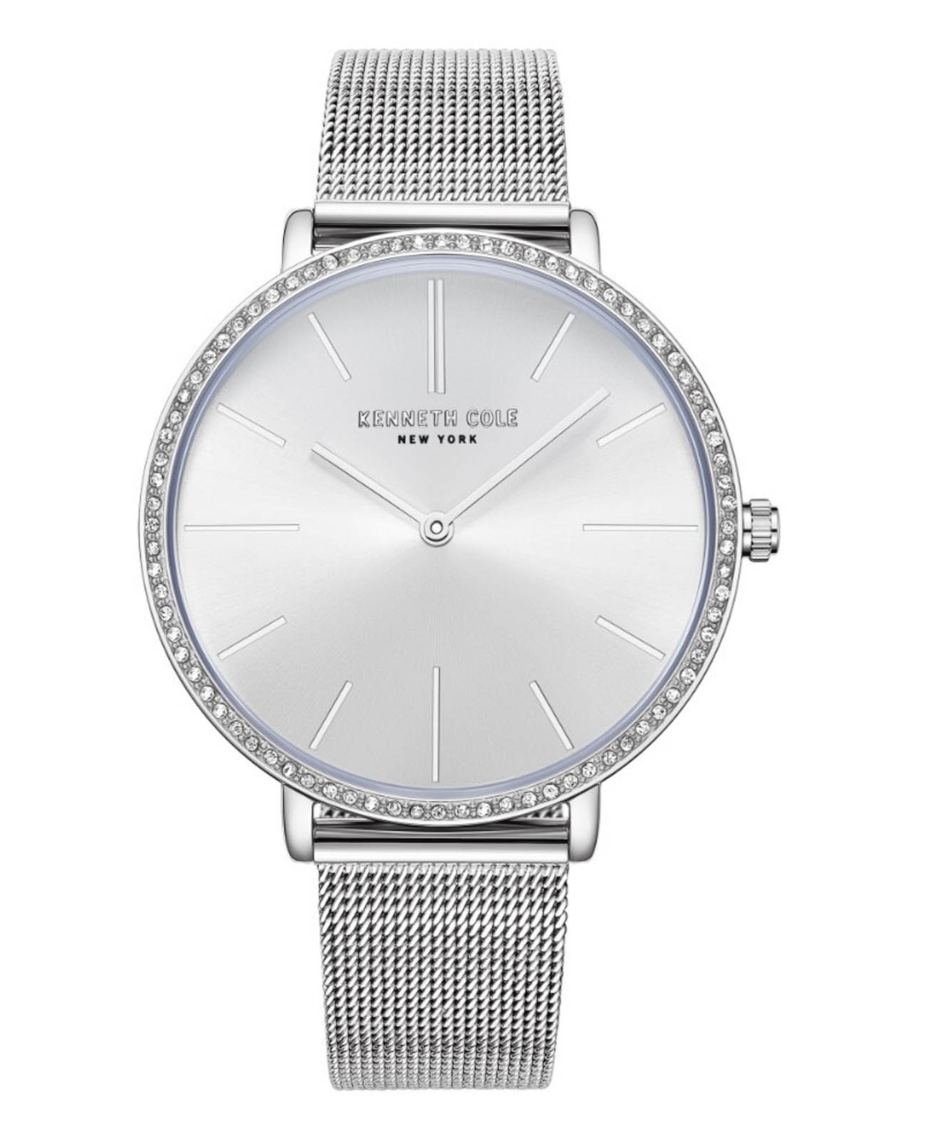 Женские часы с минеральным стекломМинеральное стеклоМинеральное стекло представляет собой искусственно выращенный минерал кварца. Такое стекло отличается особой устойчивостью к повреждениям и царапинам. Уступает по некоторым качествам сапфировому стеклу. Kenneth Cole Modern Classic KCWLA0027501, кварцевый механизм с высокой точностью. Корпус часов изготовлен из стали. БезельБезельВнешний ободок, закрепляющий стекло. В спортивных часах так называется поворотное кольцо с делениями на циферблате, выполняет роль таймера – замеряет отрезки времени на шкале. Неподвижный безель – элемент декора. Однонаправленно вращающийся безель на дайверских часах позволяет фиксировать моменты погружения и выныривания на поверхность. украшен кристаллами. Класс водозащиты: 30 метров, позволит защитить корпус от случайных брызг или капель дождя. Стальной браслет миланского плетения на раскладном замкеРаскладной замокДанный вариант застежки используется только на часах с металлическим браслетом. Отличительная особенность такого крепления в том, что длина браслета становится универсальной и вы можете самостоятельно отрегулировать нужный вам размер – застежка просто двигается по браслету часов.. В комплекте кожаный ремешок на стандартной застежке.