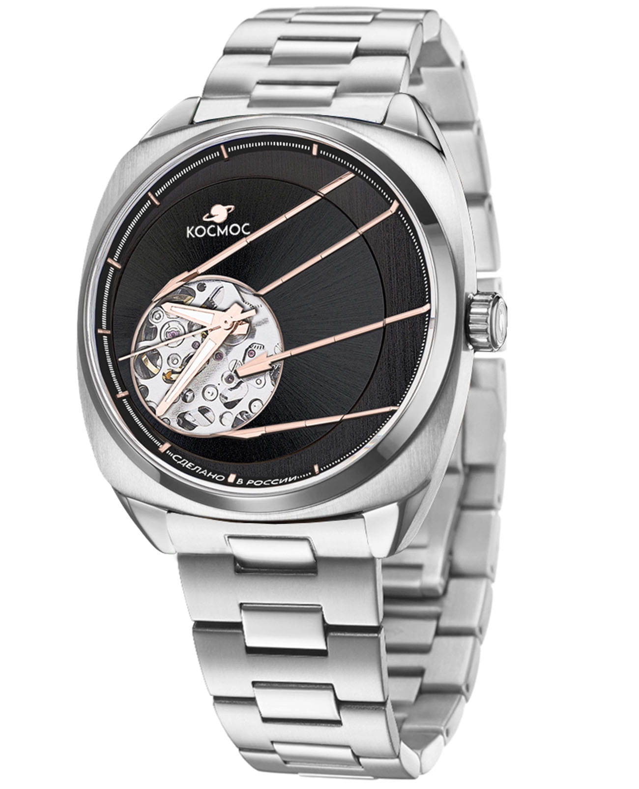 Мужские наручные часы Космос Спутник K 115.10.34 — это уникальная лимитированная серия, созданная в честь исторического запуска первого искусственного спутника Земли. В корпусе необычной круглой формы, выполненном из гипоаллергенной нержавеющей стали 316L, работает надежный механический механизм с автоподзаводом от японской компании Seiko. Прозрачная задняя крышка, закрепленная на четырех винтах, открывает вид на сложный механизм, а на самой крышке указан индивидуальный номер модели в формате хх/50. Скелетонизированный черный циферблат защищен сапфировым стекломСапфировое стеклоПрочный и надёжный материал из кристалла сапфира синтетического происхождения, характеризующийся особой твёрдостью и устойчивостью к царапинам и повреждениям. с антибликовым покрытием, которое обеспечивает максимальную устойчивость к царапинам и идеальную видимость в любых условиях. Украшением циферблата служат крупные стрелки с люминесцентным покрытиемЛюминесцентное покрытиеПозволяет считывать показания времени в темноте. Производители наносят на стрелки, часовые индексы, безель или поверхность циферблата светонакопительный состав, дающий холодное свечение., а также специальная апертура, окаймленная элементами, напоминающими антенны Спутника. Часовая и минутная стрелки отлично читаются благодаря своему размеру и светящемуся покрытию. Браслет литой конструкции из нержавеющей стали дополнен удобной застежкой-бабочкой с двумя боковыми кнопкамиЗастёжка "бабочка"Такой вид застёжки дополняется предохранителями, помогающими избежать случайного раскрытия браслета. Обладают изящным исполнением. , что гарантирует надежную фиксацию на руке. Водозащита до 10 атм (WR100) позволяет использовать часы при плавании и других водных видах спорта без акваланга. Коллекция Спутник — это выбор для ценителей истории космических достижений и современных технологий.