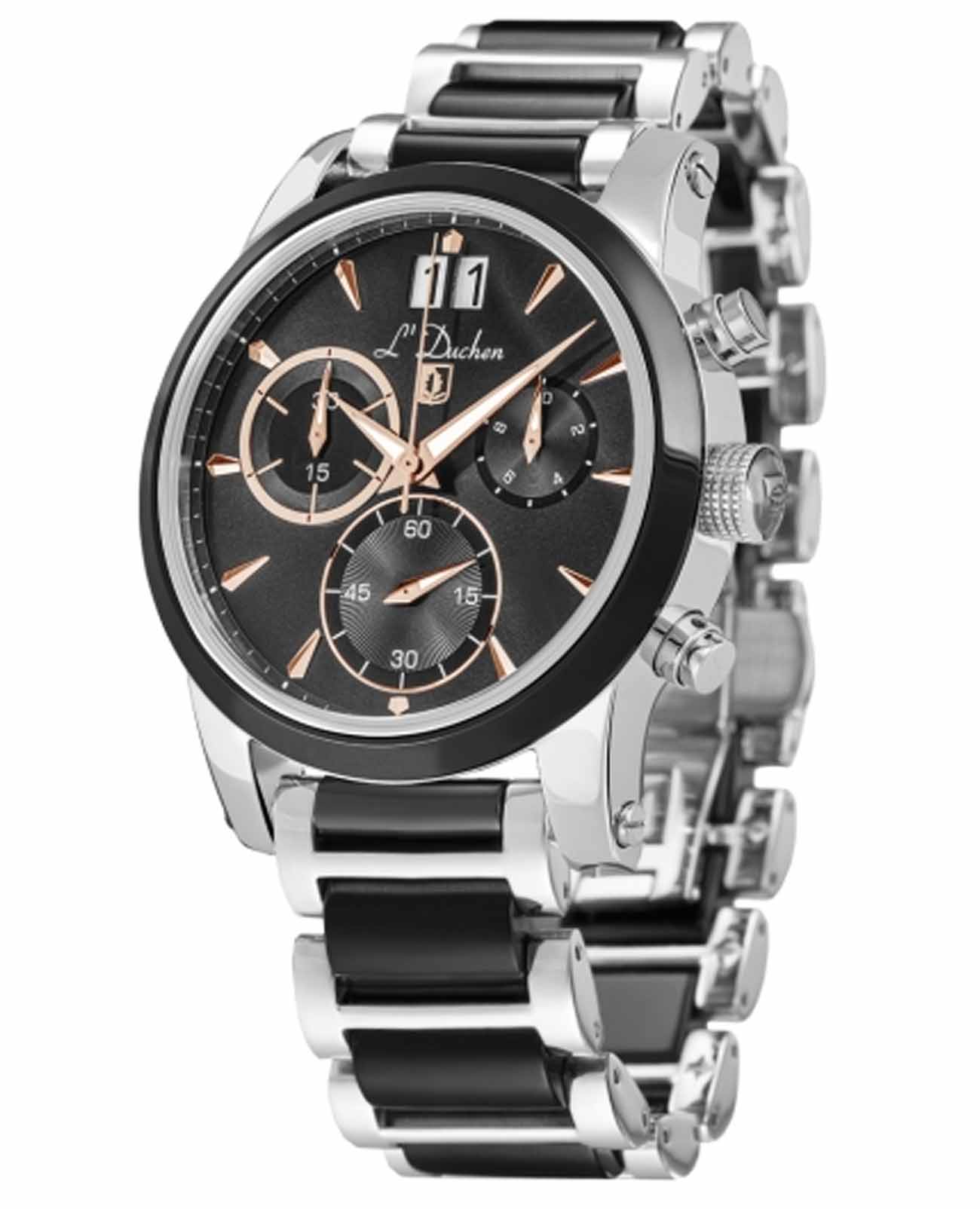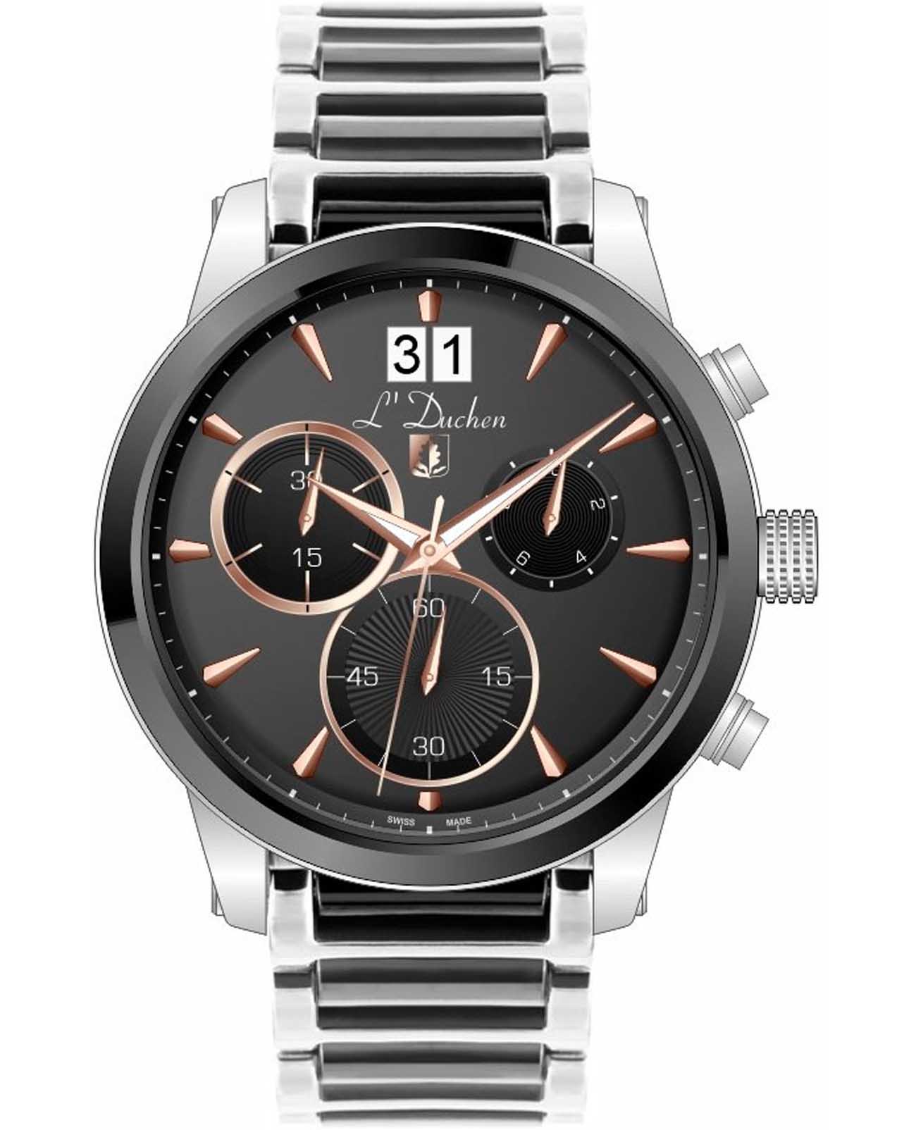 Мужские швейцарские часы-хронографХронографФункция позволяет измерять отрезки времени с особой точностью: часы, минуты, секунды. Верным признаком хронографа является наличие на циферблате 3 дополнительных окошек-счётчиков. L'Duchen Aerostat Chrono D 232.10.35 ,кварцевый механизм с высокой точностью. Сапфировое стеклоСапфировое стеклоПрочный и надёжный материал из кристалла сапфира синтетического происхождения, характеризующийся особой твёрдостью и устойчивостью к царапинам и повреждениям. устойчивое к появлению царапин, обладающее высокой прозрачностью. Корпус часов выполнен из нержавеющей стали. БезельБезельВнешний ободок, закрепляющий стекло. В спортивных часах так называется поворотное кольцо с делениями на циферблате, выполняет роль таймера – замеряет отрезки времени на шкале. Неподвижный безель – элемент декора. Однонаправленно вращающийся безель на дайверских часах позволяет фиксировать моменты погружения и выныривания на поверхность. из керамики. Стрелки с люминесцентным покрытиемЛюминесцентное покрытиеПозволяет считывать показания времени в темноте. Производители наносят на стрелки, часовые индексы, безель или поверхность циферблата светонакопительный состав, дающий холодное свечение.. Класс водозащиты: 100 метров, позволит плавать, нырять и заниматься другими водными видами спорта. Стальной браслет с керамическими вставками на застёжке «бабочка» с кнопкамиЗастёжка "бабочка"Такой вид застёжки дополняется предохранителями, помогающими избежать случайного раскрытия браслета. Обладают изящным исполнением. .