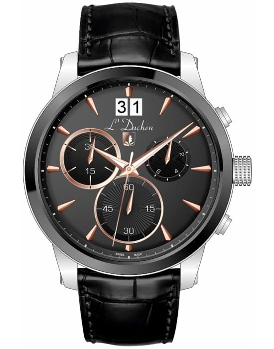 Мужские швейцарские часы-хронографХронографФункция позволяет измерять отрезки времени с особой точностью: часы, минуты, секунды. Верным признаком хронографа является наличие на циферблате 3 дополнительных окошек-счётчиков. L'Duchen Aerostat Chrono D 232.11.35 кварцевый механизм с высокой точностью. Сапфировое стеклоСапфировое стеклоПрочный и надёжный материал из кристалла сапфира синтетического происхождения, характеризующийся особой твёрдостью и устойчивостью к царапинам и повреждениям. устойчивое к появлению царапин, обладающее высокой прозрачностью. Корпус часов выполнен из нержавеющей стали. БезельБезельВнешний ободок, закрепляющий стекло. В спортивных часах так называется поворотное кольцо с делениями на циферблате, выполняет роль таймера – замеряет отрезки времени на шкале. Неподвижный безель – элемент декора. Однонаправленно вращающийся безель на дайверских часах позволяет фиксировать моменты погружения и выныривания на поверхность. из керамики. Стрелки с люминесцентным покрытиемЛюминесцентное покрытиеПозволяет считывать показания времени в темноте. Производители наносят на стрелки, часовые индексы, безель или поверхность циферблата светонакопительный состав, дающий холодное свечение.. Класс водозащиты: 100 метров, позволит плавать, нырять и заниматься другими водными видами спорта. Кожаный ремешок на застёжке «бабочка» с кнопкамиЗастёжка "бабочка"Такой вид застёжки дополняется предохранителями, помогающими избежать случайного раскрытия браслета. Обладают изящным исполнением. .