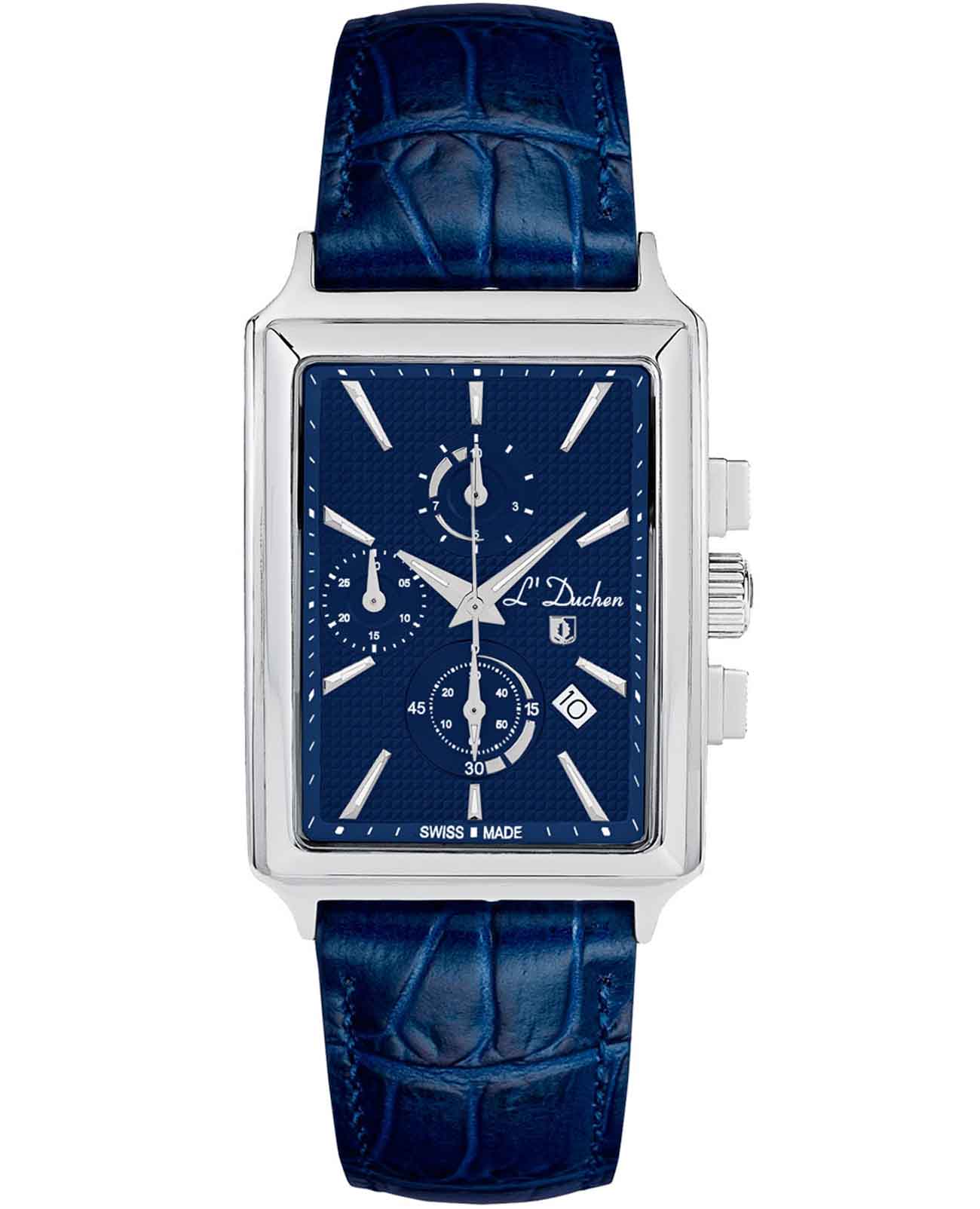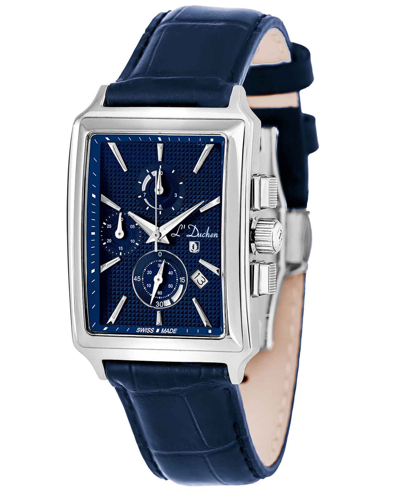 Мужские швейцарские часы- хронографХронографФункция позволяет измерять отрезки времени с особой точностью: часы, минуты, секунды. Верным признаком хронографа является наличие на циферблате 3 дополнительных окошек-счётчиков. L'Duchen Adventure Chrono D 612.13.37, кварцевый механизм с высокой точностью. Сапфировое стеклоСапфировое стеклоПрочный и надёжный материал из кристалла сапфира синтетического происхождения, характеризующийся особой твёрдостью и устойчивостью к царапинам и повреждениям. устойчивое к появлению царапин, обладающее высокой прозрачностью. Корпус часов выполнен из нержавеющей стали. Стрелки с люминесцентным покрытиемЛюминесцентное покрытиеПозволяет считывать показания времени в темноте. Производители наносят на стрелки, часовые индексы, безель или поверхность циферблата светонакопительный состав, дающий холодное свечение.. Окошко даты находится в положении между 4 и 5  часами. Класс водозащиты: 50 метров, позволит защитить корпус от случайных брызг или капель дождя. Кожаный ремешок на застёжке «бабочка» с кнопкамиЗастёжка "бабочка"Такой вид застёжки дополняется предохранителями, помогающими избежать случайного раскрытия браслета. Обладают изящным исполнением. .