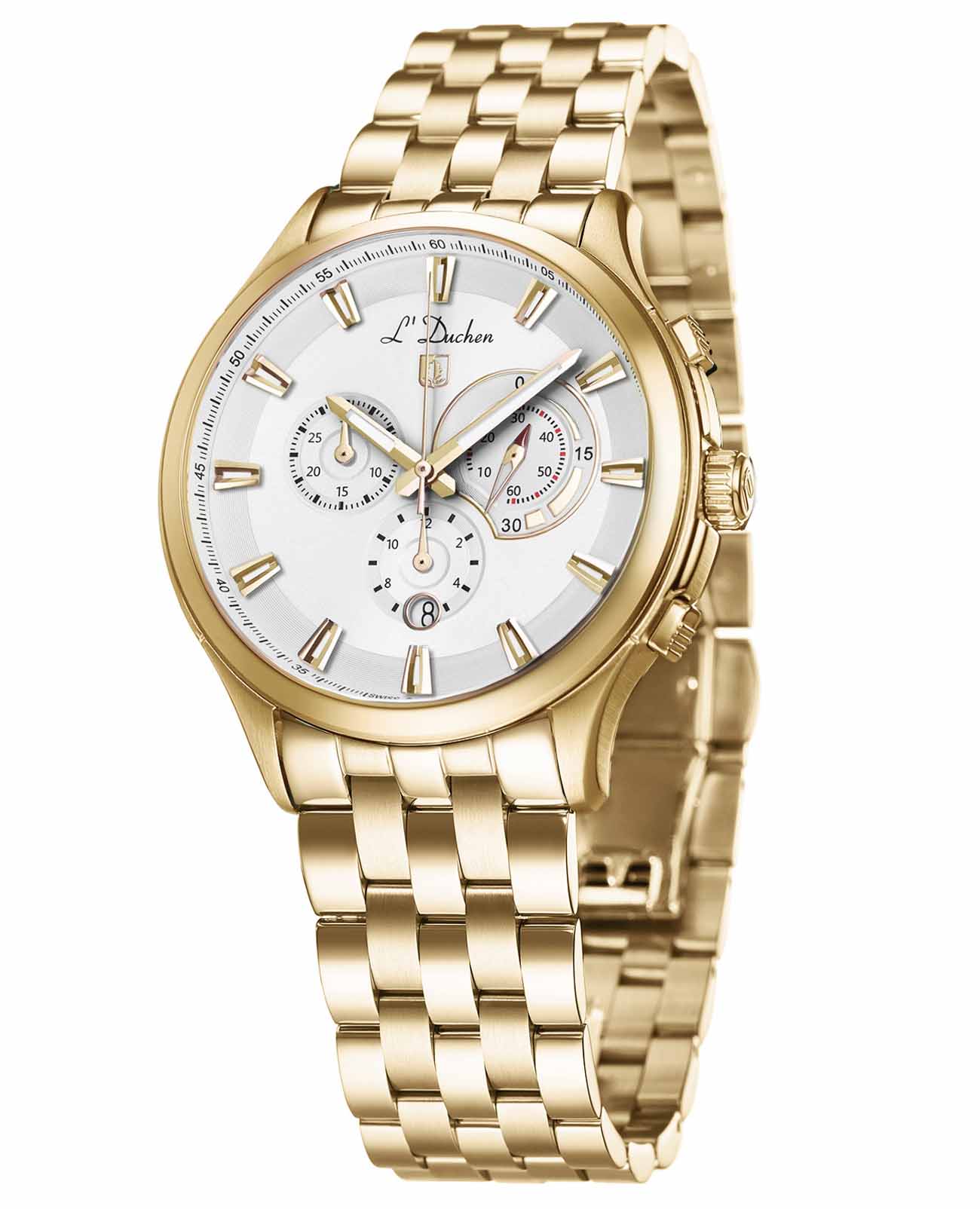 Мужские швейцарские часы- хронографХронографФункция позволяет измерять отрезки времени с особой точностью: часы, минуты, секунды. Верным признаком хронографа является наличие на циферблате 3 дополнительных окошек-счётчиков. L'Duchen Pilotage D 742.20.43, кварцевый механизм с высокой точностью. Сапфировое стеклоСапфировое стеклоПрочный и надёжный материал из кристалла сапфира синтетического происхождения, характеризующийся особой твёрдостью и устойчивостью к царапинам и повреждениям. устойчивое к появлению царапин, обладающее высокой прозрачностью. Корпус часов выполнен из нержавеющей стали с PVD-покрытиемPVDУльтратонкое покрытие наносится в технике вакуумного напыления, сочетает в себе нитрид титана особой прочности со слоем золота или оксида хрома. Несёт в себе декоративную или защитную функцию.. Стрелки с люминесцентным покрытиемЛюминесцентное покрытиеПозволяет считывать показания времени в темноте. Производители наносят на стрелки, часовые индексы, безель или поверхность циферблата светонакопительный состав, дающий холодное свечение.. Класс водозащиты: 100 метров, позволит плавать, нырять и заниматься другими водными видами спорта. Стальной браслет с PVD-покрытиемPVDУльтратонкое покрытие наносится в технике вакуумного напыления, сочетает в себе нитрид титана особой прочности со слоем золота или оксида хрома. Несёт в себе декоративную или защитную функцию. на застёжке «бабочка» с кнопкамиЗастёжка "бабочка"Такой вид застёжки дополняется предохранителями, помогающими избежать случайного раскрытия браслета. Обладают изящным исполнением. .