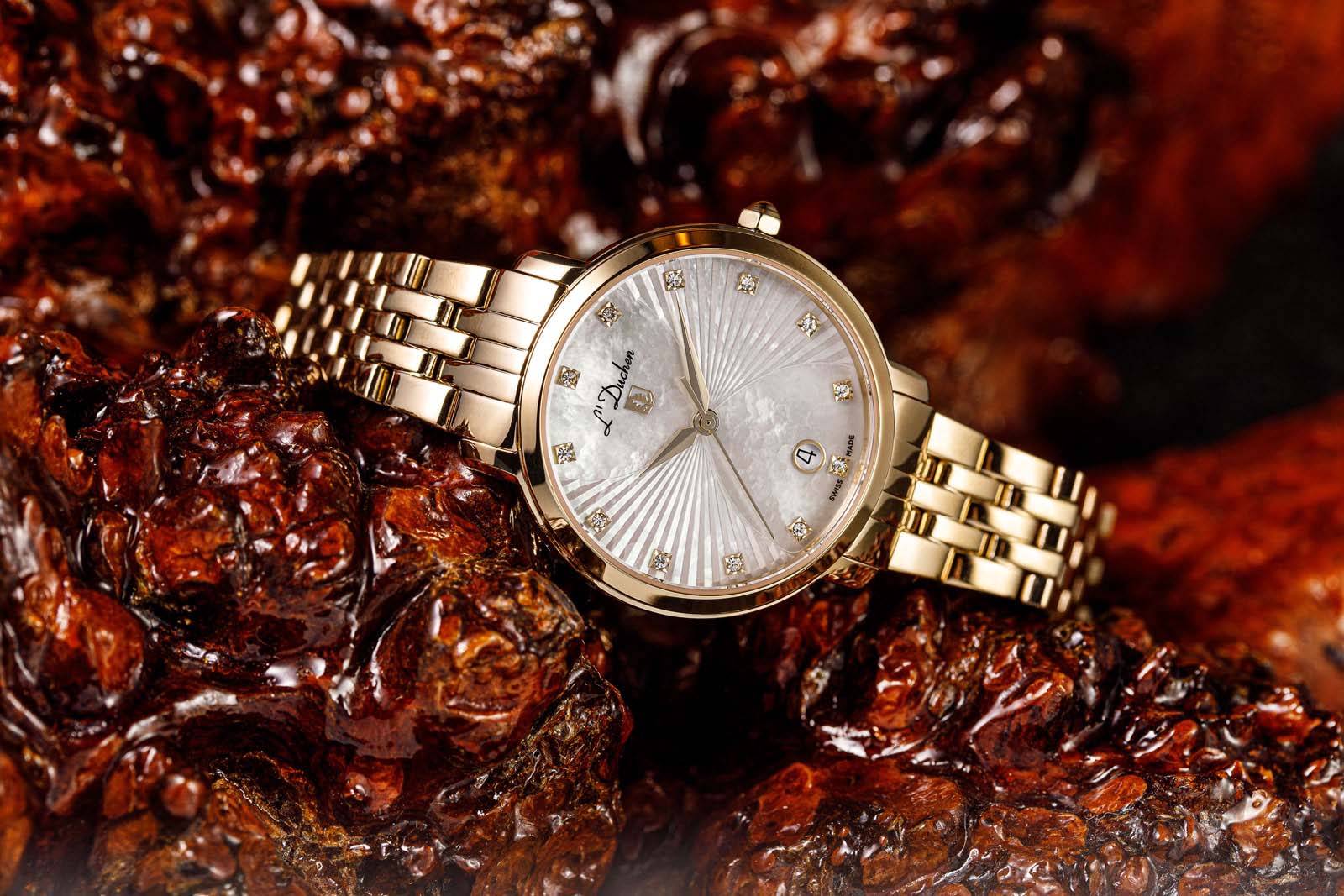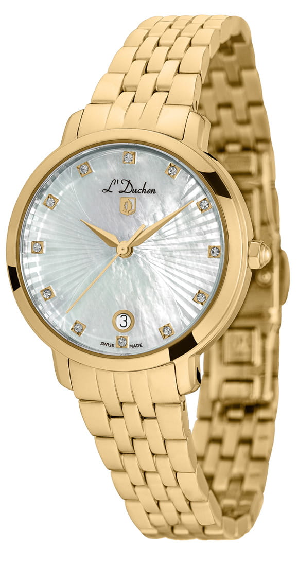 Женские швейцарские часы L'Duchen Eternity D 801.20.33, кварцевый механизм с высокой точностью. Сапфировое стеклоСапфировое стеклоПрочный и надёжный материал из кристалла сапфира синтетического происхождения, характеризующийся особой твёрдостью и устойчивостью к царапинам и повреждениям. устойчивое к появлению царапин, обладающее высокой прозрачностью. Корпус часов выполнен из нержавеющей стали с PVD-покрытиемPVDУльтратонкое покрытие наносится в технике вакуумного напыления, сочетает в себе нитрид титана особой прочности со слоем золота или оксида хрома. Несёт в себе декоративную или защитную функцию.. Окошко даты находится в положении 6 часов. Класс водозащиты: 50 метров, позволит защитить корпус от случайных брызг или капель дождя. Стальной браслет с PVD-покрытиемPVDУльтратонкое покрытие наносится в технике вакуумного напыления, сочетает в себе нитрид титана особой прочности со слоем золота или оксида хрома. Несёт в себе декоративную или защитную функцию. на застёжке «бабочка» с кнопкамиЗастёжка "бабочка"Такой вид застёжки дополняется предохранителями, помогающими избежать случайного раскрытия браслета. Обладают изящным исполнением. .