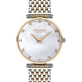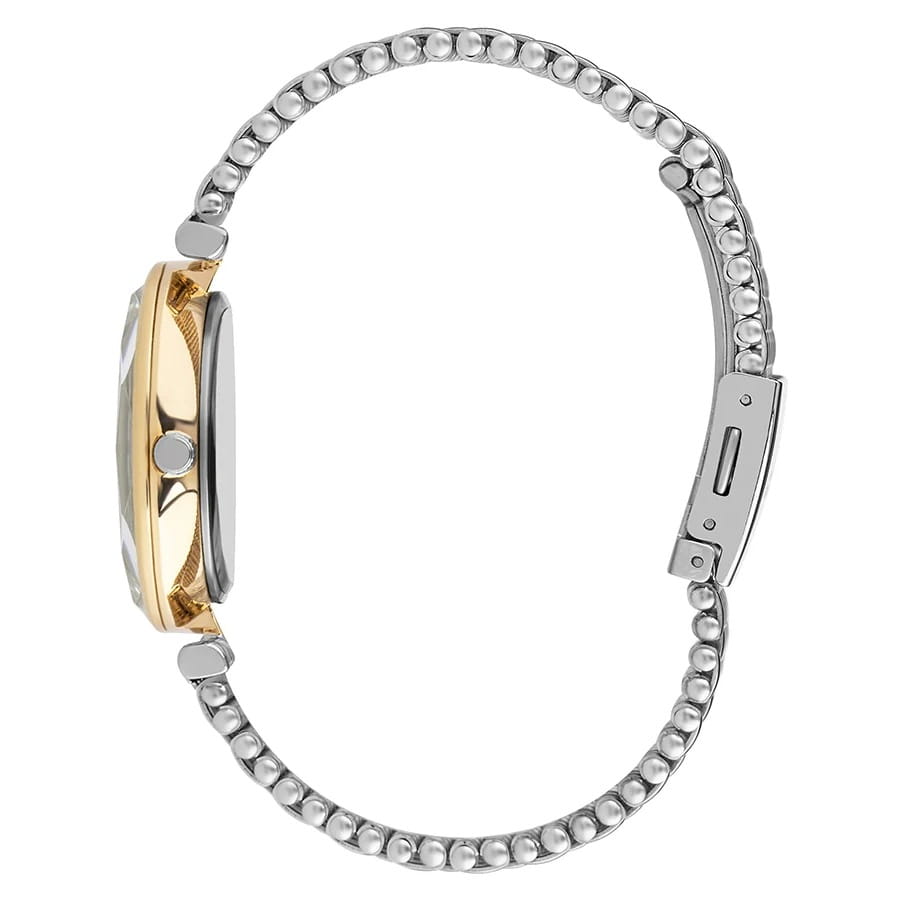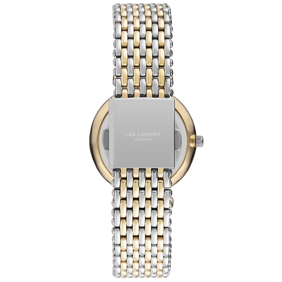 Женские наручные часы Lee Cooper LC07410.220 — это элегантная модель с утончённым дизайном. Корпус диаметром 33 мм выполнен из нержавеющей стали с IP-покрытиемIP-покрытиеМетод ионного напыления. Демонстрирует повышенную устойчивость к истиранию, окислению и химическим веществам. Под воздействием высокого давления и температуры около 1500°C молекулы металла надёжно соединяются с частицами корпуса часов., что придаёт часам изысканный вид. Перламутровый циферблат украшен изящными метками из кристаллов и стрелками, обеспечивая удобное считывание времени. Циферблат защищён минеральным стекломМинеральное стеклоМинеральное стекло представляет собой искусственно выращенный минерал кварца. Такое стекло отличается особой устойчивостью к повреждениям и царапинам. Уступает по некоторым качествам сапфировому стеклу., устойчивым к царапинам. Часы работают на кварцевом механизме, обеспечивая точность хода. Браслет из нержавеющей стали с раскладной застёжкойРаскладная застёжкаТакой тип застёжки используется только на браслетах из металла. Она никогда не раскрывается полностью, происходит разделение на 2 и более частей. Раскладывающая застёжка снизит вероятность потери часов к минимуму. гарантирует комфортное ношение и надёжную фиксацию на запястье. Водозащита 30 метров защищает часы от случайных брызг и дождя, делая их подходящими для повседневного использования.