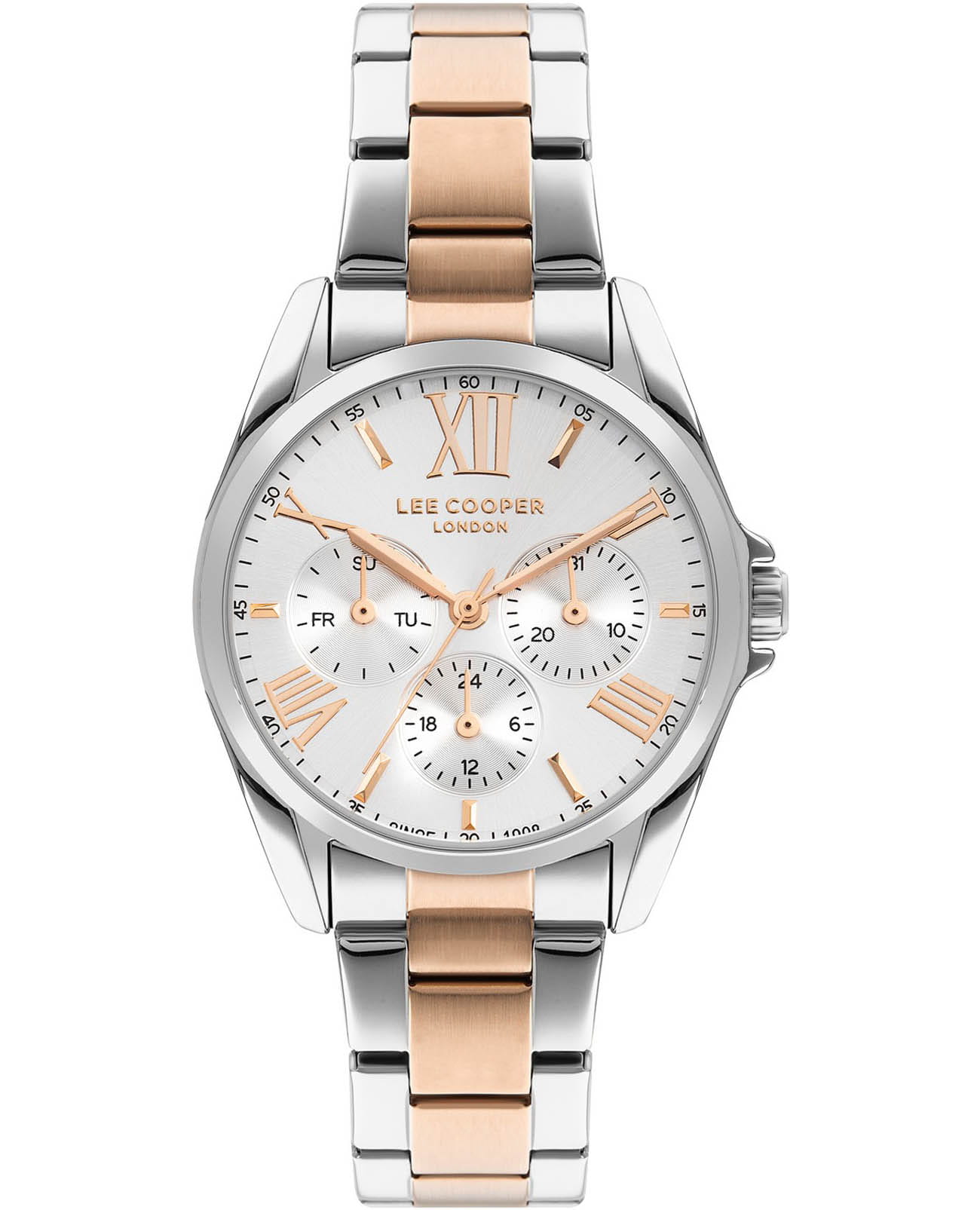 Женские часы Lee Cooper LC07685.530 — это стильное сочетание элегантности и современного дизайна. Круглый корпус диаметром 36 мм выполнен из суперметалла, придающий модели особый блеск. Серебристый циферблат с золотыми индексами защищен минеральным стекломМинеральное стеклоМинеральное стекло представляет собой искусственно выращенный минерал кварца. Такое стекло отличается особой устойчивостью к повреждениям и царапинам. Уступает по некоторым качествам сапфировому стеклу., обеспечивающим устойчивость к царапинам. Часы оснащены надежным кварцевым механизмом, а стальной браслет с частичным IP-покрытиемIP-покрытиеМетод ионного напыления. Демонстрирует повышенную устойчивость к истиранию, окислению и химическим веществам. Под воздействием высокого давления и температуры около 1500°C молекулы металла надёжно соединяются с частицами корпуса часов. на раскладной застёжкеРаскладная застёжкаТакой тип застёжки используется только на браслетах из металла. Она никогда не раскрывается полностью, происходит разделение на 2 и более частей. Раскладывающая застёжка снизит вероятность потери часов к минимуму. гарантирует комфортную посадку на запястье. Мультифункциональная модель с индикацией даты, дня недели, с дополнительным 24-х часовым индикатором. Водозащита 30 метров защищает модель от случайных брызг и дождя. Lee Cooper — это идеальный выбор для тех, кто ценит классический стиль, точность механизма и качество материалов в одном аксессуаре.