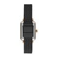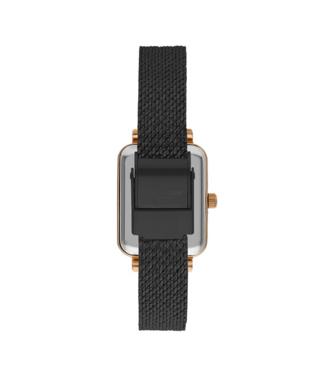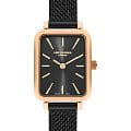Циферблат черного цвета украшен индексами и стрелками с IP-покрытием розового золота, гармонично дополняя классический дизайн модели. Форма корпуса прямоугольная с размерами 20,5 x 26 мм, что делает часы компактными и удобными для повседневной носки.