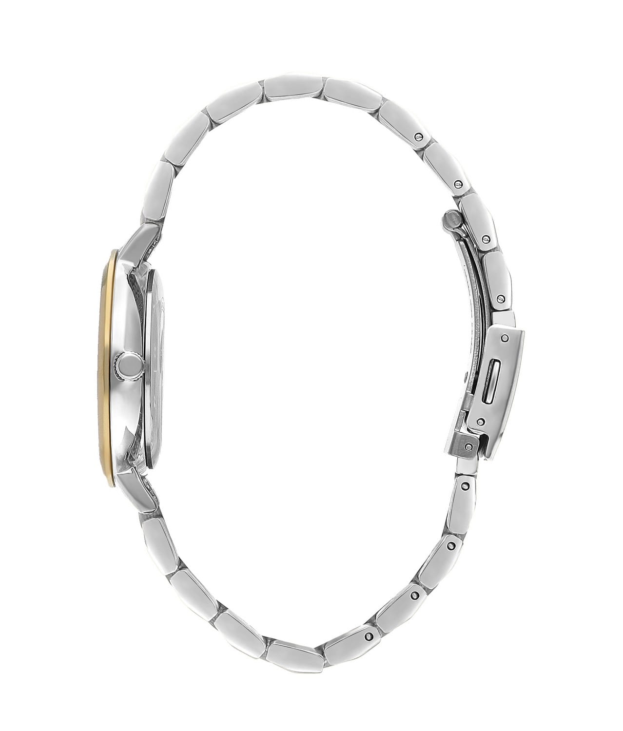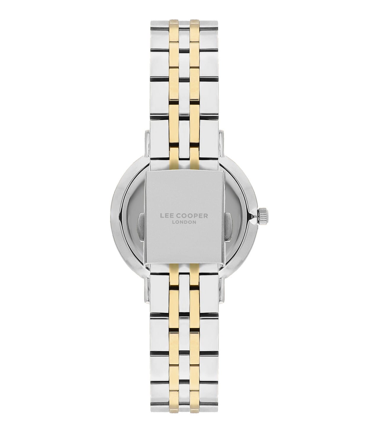 Женские часы Lee Cooper LC07857.230 — это стильное сочетание элегантности и современного дизайна. Изящный круглый корпус диаметром 34 мм выполнен из суперметалла с безелемБезельВнешний ободок, закрепляющий стекло. В спортивных часах так называется поворотное кольцо с делениями на циферблате, выполняет роль таймера – замеряет отрезки времени на шкале. Неподвижный безель – элемент декора. Однонаправленно вращающийся безель на дайверских часах позволяет фиксировать моменты погружения и выныривания на поверхность. с IP-покрытиемIP-покрытиеМетод ионного напыления. Демонстрирует повышенную устойчивость к истиранию, окислению и химическим веществам. Под воздействием высокого давления и температуры около 1500°C молекулы металла надёжно соединяются с частицами корпуса часов. золотого цвета, что придает модели особый блеск. Серебристый циферблат защищен минеральным стекломМинеральное стеклоМинеральное стекло представляет собой искусственно выращенный минерал кварца. Такое стекло отличается особой устойчивостью к повреждениям и царапинам. Уступает по некоторым качествам сапфировому стеклу., обеспечивающим устойчивость к царапинам. Метки в виде штрихов. Часы оснащены надежным кварцевым механизмом, а стальной браслет с частичным IP-покрытиемIP-покрытиеМетод ионного напыления. Демонстрирует повышенную устойчивость к истиранию, окислению и химическим веществам. Под воздействием высокого давления и температуры около 1500°C молекулы металла надёжно соединяются с частицами корпуса часов. на раскладной застёжкеРаскладная застёжкаТакой тип застёжки используется только на браслетах из металла. Она никогда не раскрывается полностью, происходит разделение на 2 и более частей. Раскладывающая застёжка снизит вероятность потери часов к минимуму. гарантирует комфортную посадку на запястье. Водозащита 30 метров защищает модель от случайных брызг и дождя. В комплекте к часам идет дополнительный браслет. Lee Cooper  — отличный выбор для тех, кто ценит утонченность и качество.