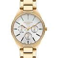 Женские часы Lee Cooper LC07863.170 — это стильное сочетание элегантности и современного дизайна. Круглый корпус диаметром 34 мм выполнен из суперметалла с IP-покрытиемIP-покрытиеМетод ионного напыления. Демонстрирует повышенную устойчивость к истиранию, окислению и химическим веществам. Под воздействием высокого давления и температуры около 1500°C молекулы металла надёжно соединяются с частицами корпуса часов. золотого цвета, а неподвижный безельБезельВнешний ободок, закрепляющий стекло. В спортивных часах так называется поворотное кольцо с делениями на циферблате, выполняет роль таймера – замеряет отрезки времени на шкале. Неподвижный безель – элемент декора. Однонаправленно вращающийся безель на дайверских часах позволяет фиксировать моменты погружения и выныривания на поверхность. украшен цирконами, придающими модели особый блеск. Серебристый циферблат защищен минеральным стекломМинеральное стеклоМинеральное стекло представляет собой искусственно выращенный минерал кварца. Такое стекло отличается особой устойчивостью к повреждениям и царапинам. Уступает по некоторым качествам сапфировому стеклу., обеспечивающим устойчивость к царапинам. Метки в виде штрихов. Часы оснащены надежным кварцевым механизмом, а металлический браслет с IP-покрытиемIP-покрытиеМетод ионного напыления. Демонстрирует повышенную устойчивость к истиранию, окислению и химическим веществам. Под воздействием высокого давления и температуры около 1500°C молекулы металла надёжно соединяются с частицами корпуса часов. на раскладной застёжкеРаскладная застёжкаТакой тип застёжки используется только на браслетах из металла. Она никогда не раскрывается полностью, происходит разделение на 2 и более частей. Раскладывающая застёжка снизит вероятность потери часов к минимуму. гарантирует комфортную посадку на запястье. Мультифункциональная модель с индикацией даты, дня недели, с дополнительным 24-х часовым индикатором. Водозащита 30 метров защищает модель от случайных брызг и дождя. Lee Cooper — отличный выбор для тех, кто ценит утонченность и качество.