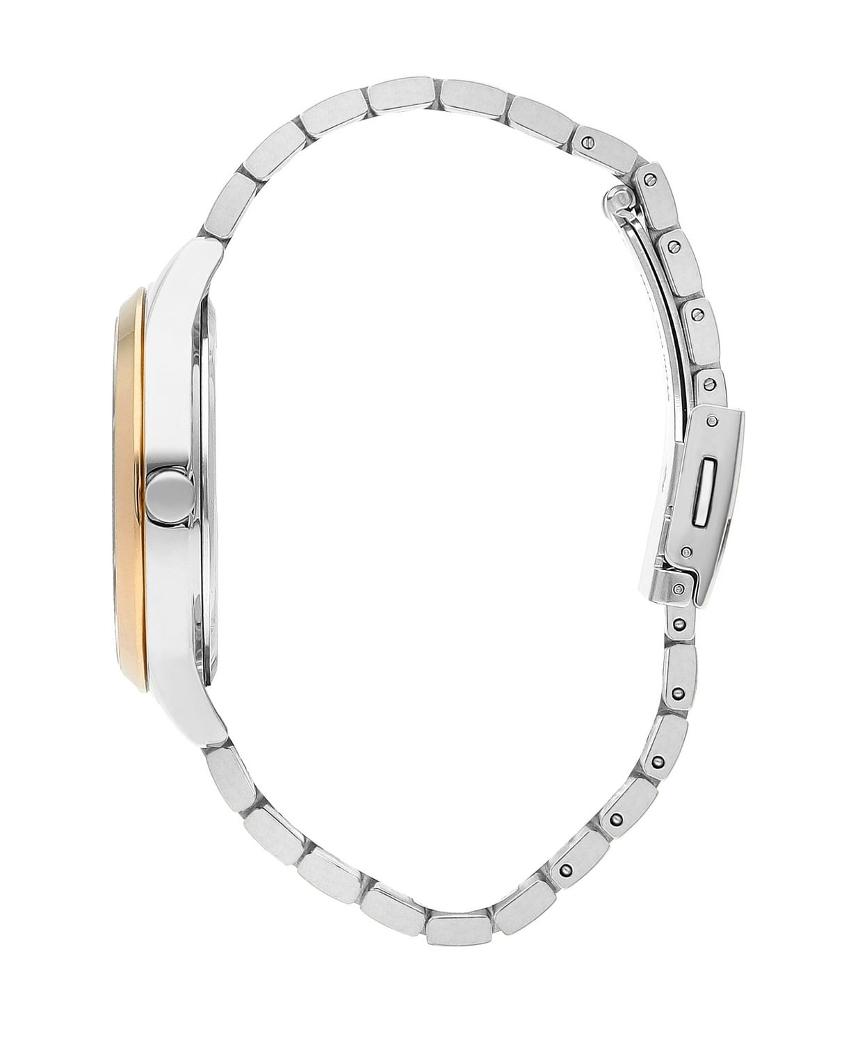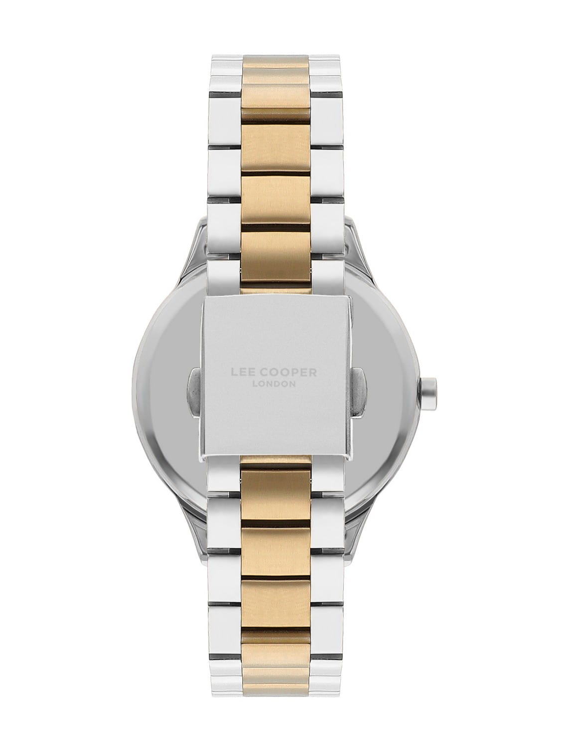 Женские часы Lee Cooper LC07865.230 — это стильное сочетание элегантности и современного дизайна. Круглый корпус диаметром 38 мм выполнен из суперметалла с  безелемБезельВнешний ободок, закрепляющий стекло. В спортивных часах так называется поворотное кольцо с делениями на циферблате, выполняет роль таймера – замеряет отрезки времени на шкале. Неподвижный безель – элемент декора. Однонаправленно вращающийся безель на дайверских часах позволяет фиксировать моменты погружения и выныривания на поверхность. с IP-покрытиемIP-покрытиеМетод ионного напыления. Демонстрирует повышенную устойчивость к истиранию, окислению и химическим веществам. Под воздействием высокого давления и температуры около 1500°C молекулы металла надёжно соединяются с частицами корпуса часов. золотого цвета, придающий модели особый блеск. Серебристый циферблат защищен минеральным стекломМинеральное стеклоМинеральное стекло представляет собой искусственно выращенный минерал кварца. Такое стекло отличается особой устойчивостью к повреждениям и царапинам. Уступает по некоторым качествам сапфировому стеклу., обеспечивающим устойчивость к царапинам. Часы оснащены надежным кварцевым механизмом, а стальной браслет с частичным IP-покрытиемIP-покрытиеМетод ионного напыления. Демонстрирует повышенную устойчивость к истиранию, окислению и химическим веществам. Под воздействием высокого давления и температуры около 1500°C молекулы металла надёжно соединяются с частицами корпуса часов. на раскладной застёжкеРаскладная застёжкаТакой тип застёжки используется только на браслетах из металла. Она никогда не раскрывается полностью, происходит разделение на 2 и более частей. Раскладывающая застёжка снизит вероятность потери часов к минимуму. гарантирует комфортную посадку на запястье. Мультифункциональная модель с индикацией даты, дня недели, с дополнительным 24-х часовым индикатором. Водозащита 30 метров защищает модель от случайных брызг и дождя. Lee Cooper  — отличный выбор для тех, кто ценит утонченность и качество.