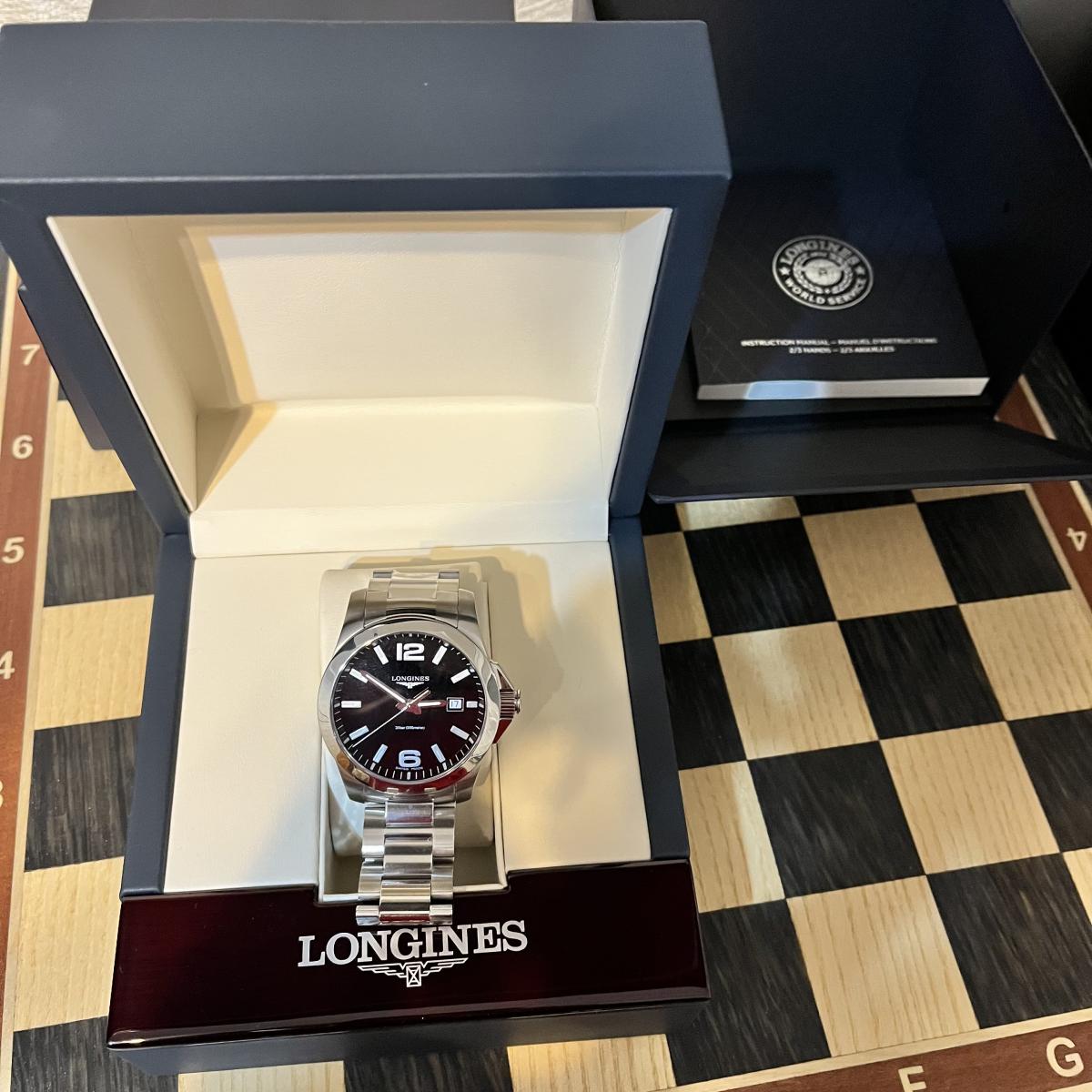 Часы Longines Conquest L3.759.4.58.6 сочетают спортивную элегантность и высокую функциональность, характерные для коллекции Conquest. Корпус диаметром 41 мм выполнен из нержавеющей стали с водозащитой до 30 бар (300 метров). Завинчивающаяся заводная головка и задняя крышка подчёркивают надёжность. Чёрный лакированный циферблат с полированной отделкой оснащён накладными арабскими цифрами и индексами, индексы с люминесцентным покрытиемЛюминесцентное покрытиеПозволяет считывать показания времени в темноте. Производители наносят на стрелки, часовые индексы, безель или поверхность циферблата светонакопительный состав, дающий холодное свечение., а также окошком даты в положении «3 часа». Циферблат защищён сапфировым стекломСапфировое стеклоПрочный и надёжный материал из кристалла сапфира синтетического происхождения, характеризующийся особой твёрдостью и устойчивостью к царапинам и повреждениям. с антибликовым покрытиемАнтибликовое покрытиеСлой оксида металла в 0,13-0,3 микрон, благодаря которому стекло часов не бликует и не отражает свет. Антибликовое покрытие уменьшает отражение света в 10 раз, обеспечивая отличную читаемость показателей циферблата.. Модель оснащена кварцевым механизмом Longines L157 с функцией индикации окончания срока службы батареи EOLEOLПредставляет собой систему, уведомляющую владельца часов о необходимости замены элемента питания. За 2 недели до полного разряда батарейки секундная стрелка перестаёт ходить чётко и начинает перепрыгивать на 3-4 деления.. Окошко даты расположено в позиции «3 часа». Браслет из нержавеющей стали с застёжкой бабочкойЗастёжка "бабочка"Такой вид застёжки дополняется предохранителями, помогающими избежать случайного раскрытия браслета. Обладают изящным исполнением. и механизмом открытия с кнопками обеспечивает комфортное и надёжное ношение. Эти часы идеально подходят для тех, кто ценит надёжность, спортивный стиль и элегантность.