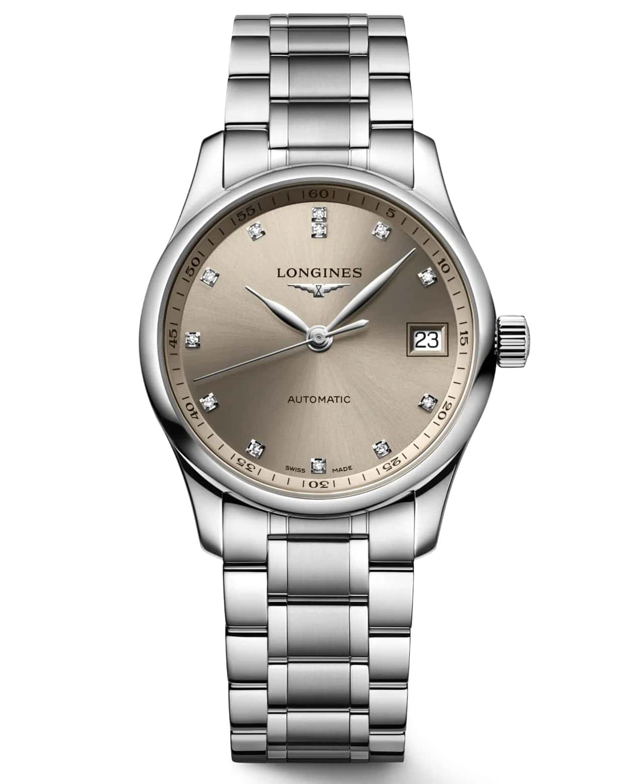Швейцарские механические часы Longines Master Collection L2.357.4.07.6. Сапфировое стеклоСапфировое стеклоПрочный и надёжный материал из кристалла сапфира синтетического происхождения, характеризующийся особой твёрдостью и устойчивостью к царапинам и повреждениям. устойчивое к появлению царапин, обладающее высокой прозрачностью. Корпус часов изготовлен из нержавеющей стали. Циферблат с 13 бриллиантами группы Top Wesselton VS-SI общим весом 0.059 карата. Окошко даты в положении 3 часа. Автоматический механизм с частотой баланса 25 200 полуколебаний в час и запасом хода, которого хватает примерно на 72 часа работы. Класс водозащиты: 30 метров, позволит защитить корпус от случайных брызг или капель дождя. Стальной браслет на застёжке «бабочка» с кнопкамиЗастёжка "бабочка"Такой вид застёжки дополняется предохранителями, помогающими избежать случайного раскрытия браслета. Обладают изящным исполнением. .