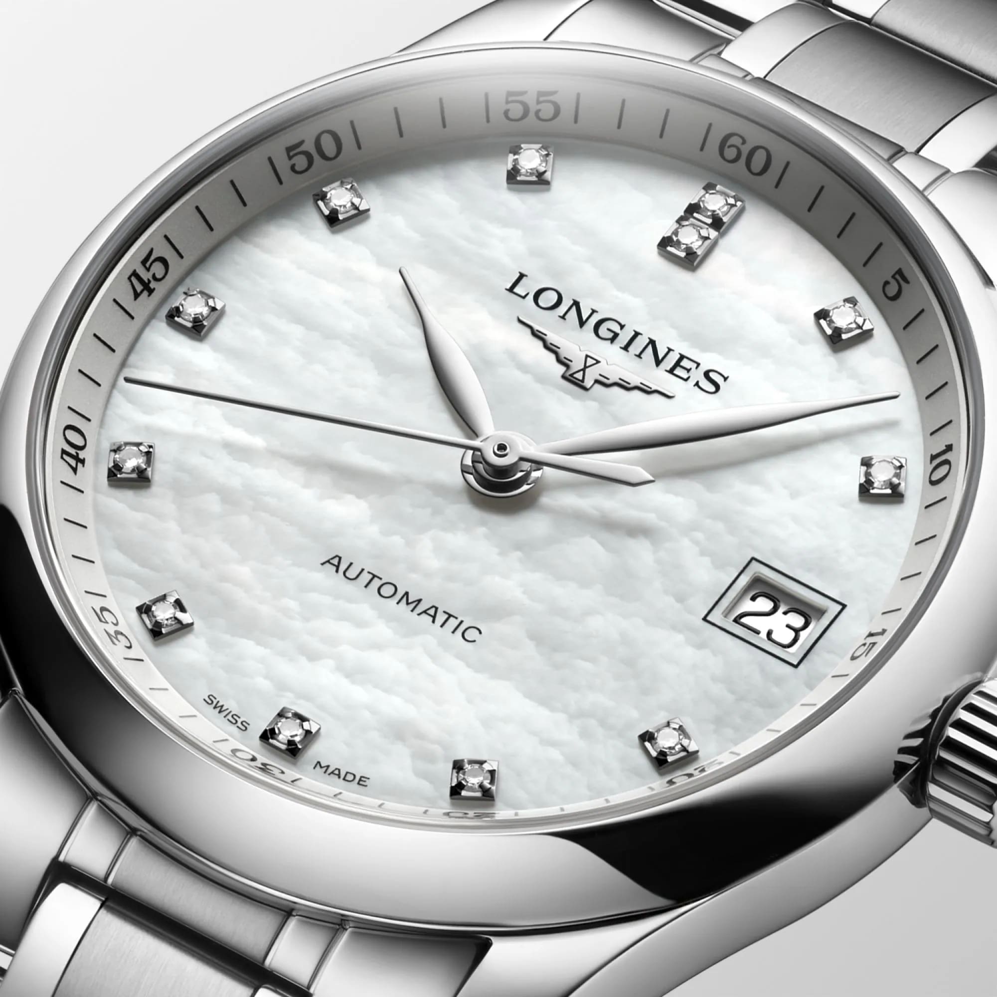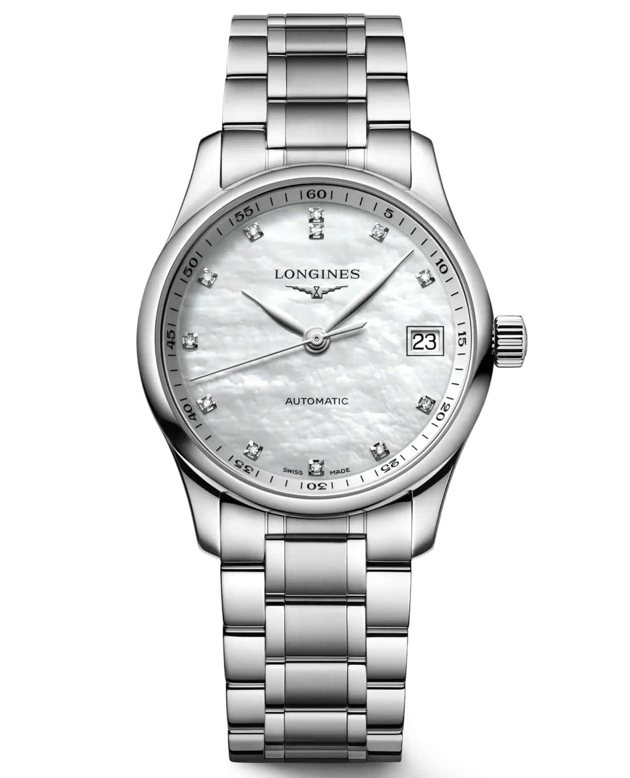 Швейцарские механические часы Longines Master Collection L2.357.4.87.6. Сапфировое стеклоСапфировое стеклоПрочный и надёжный материал из кристалла сапфира синтетического происхождения, характеризующийся особой твёрдостью и устойчивостью к царапинам и повреждениям. устойчивое к появлению царапин, обладающее высокой прозрачностью. Корпус часов изготовлен из нержавеющей стали. Циферблат с 12 бриллиантами группы Top Wesselton VS-SI общим весом 0.055 карата. Окошко даты в положении 3 часа. Автоматический механизм с частотой баланса 25 200 полуколебаний в час и запасом хода, которого хватает примерно на 72 часа работы. Класс водозащиты: 30 метров, позволит защитить корпус от случайных брызг или капель дождя. Стальной браслет на застёжке «бабочка» с кнопкамиЗастёжка "бабочка"Такой вид застёжки дополняется предохранителями, помогающими избежать случайного раскрытия браслета. Обладают изящным исполнением. .