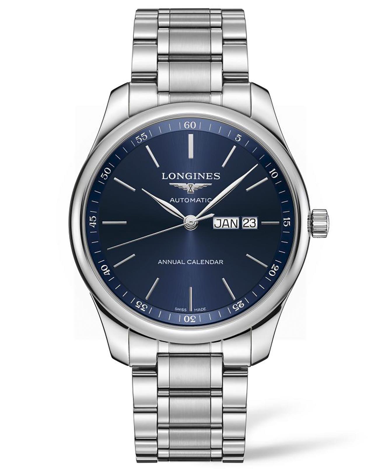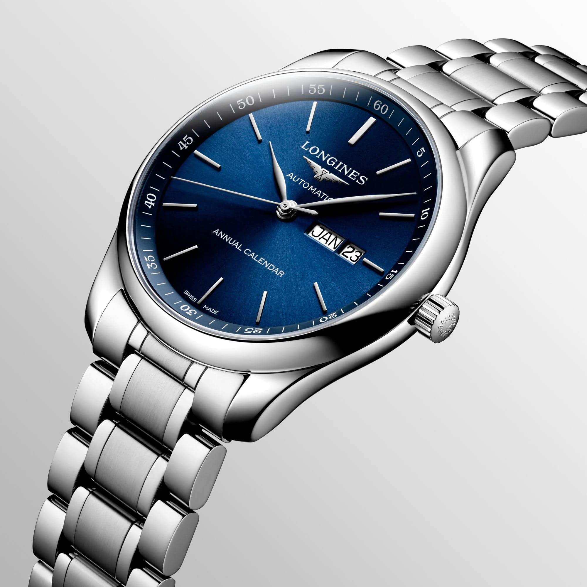 Часы Longines Master Collection Annual Calendar (артикул L29204926) сочетают в себе элегантность и функциональность, отражая богатое часовое наследие Longines. Корпус диаметром 42 мм выполнен из нержавеющей стали с водозащитой до 3 бар (30 метров). Синий циферблат с солнечным узором оснащён накладными индексами, серебристыми полированными стрелками и указателем месяца и даты в положении «3 часа». Циферблат защищён сапфировым стекломСапфировое стеклоПрочный и надёжный материал из кристалла сапфира синтетического происхождения, характеризующийся особой твёрдостью и устойчивостью к царапинам и повреждениям. с антибликовым покрытием.