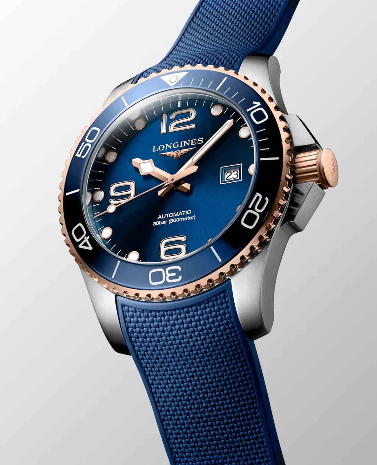 Мужские швейцарские механические часы для дайвинга Longines Hydroconquest L3.782.3.98.9. Сапфировое стеклоСапфировое стеклоПрочный и надёжный материал из кристалла сапфира синтетического происхождения, характеризующийся особой твёрдостью и устойчивостью к царапинам и повреждениям. с многослойным антибликовым покрытием с обеих сторон, устойчивое к появлению царапин, обладающее высокой прозрачностью. Корпус часов изготовлен из стали. Вращающийся безельБезельВнешний ободок, закрепляющий стекло. В спортивных часах так называется поворотное кольцо с делениями на циферблате, выполняет роль таймера – замеряет отрезки времени на шкале. Неподвижный безель – элемент декора. Однонаправленно вращающийся безель на дайверских часах позволяет фиксировать моменты погружения и выныривания на поверхность. из стали с PVD-покрытиемPVDУльтратонкое покрытие наносится в технике вакуумного напыления, сочетает в себе нитрид титана особой прочности со слоем золота или оксида хрома. Несёт в себе декоративную или защитную функцию. и керамики, защищенный от царапин, никогда не изнашивается и не выцветает. Стрелки и метки с люминесцентным покрытиемЛюминесцентное покрытиеПозволяет считывать показания времени в темноте. Производители наносят на стрелки, часовые индексы, безель или поверхность циферблата светонакопительный состав, дающий холодное свечение.. Окошко даты находится в положении 3 часов. Класс водозащиты: 300 метров, позволит плавать, нырять и заниматься другими водными видами спорта. Каучковый ремешок на раскладной застёжкеРаскладная застёжкаТакой тип застёжки используется только на браслетах из металла. Она никогда не раскрывается полностью, происходит разделение на 2 и более частей. Раскладывающая застёжка снизит вероятность потери часов к минимуму..