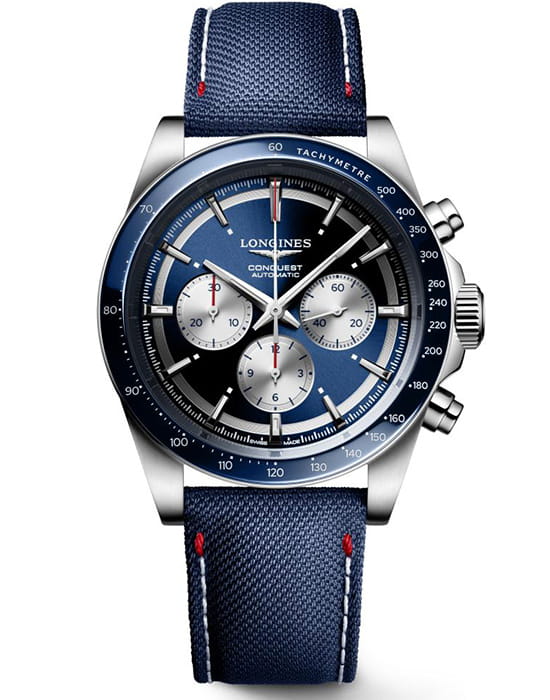 Мужские швейцарские механические часы- хронографХронографФункция позволяет измерять отрезки времени с особой точностью: часы, минуты, секунды. Верным признаком хронографа является наличие на циферблате 3 дополнительных окошек-счётчиков. Longines Conquest L3.835.4.91.2. Сапфировое стеклоСапфировое стеклоПрочный и надёжный материал из кристалла сапфира синтетического происхождения, характеризующийся особой твёрдостью и устойчивостью к царапинам и повреждениям. с многослойным антибликовым покрытием с обеих сторон, устойчивое к появлению царапин, обладающее высокой прозрачностью. Корпус часов изготовлен из стали. Неподвижный безельБезельВнешний ободок, закрепляющий стекло. В спортивных часах так называется поворотное кольцо с делениями на циферблате, выполняет роль таймера – замеряет отрезки времени на шкале. Неподвижный безель – элемент декора. Однонаправленно вращающийся безель на дайверских часах позволяет фиксировать моменты погружения и выныривания на поверхность. из стали и керамики, защищенный от царапин, никогда не изнашивается и не выцветает. Шкала тахиметраТахиметрРазмеченная шкала, располагается на ободке или безеле часов. Тахиметр позволяет рассчитать скорость на определённом участке пути, расстояние измеряется в километрах или милях.. На циферблате расположены три дополнительных циферблата. Стрелки и метки с люминесцентным покрытиемЛюминесцентное покрытиеПозволяет считывать показания времени в темноте. Производители наносят на стрелки, часовые индексы, безель или поверхность циферблата светонакопительный состав, дающий холодное свечение.. Класс водозащиты: 100 метров, позволит плавать, нырять и заниматься другими водными видами спорта. Тканевый ремешок на раскладной застёжкеРаскладная застёжкаТакой тип застёжки используется только на браслетах из металла. Она никогда не раскрывается полностью, происходит разделение на 2 и более частей. Раскладывающая застёжка снизит вероятность потери часов к минимуму.. Лимитированная серия.