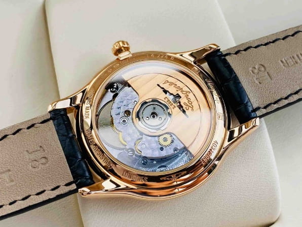 . Инкрустация бриллиантами превращает элегантные часы в изысканное украшение. Механизм с автоматическим подзаводом работает от амплитуды движения руки. Благодаря прозрачной задней крышке корпуса можно увидеть практически все детали механизма. Ремешок из кожи аллигатора с простой, подчеркивающей минимализм дизайна, золотой застежкой.