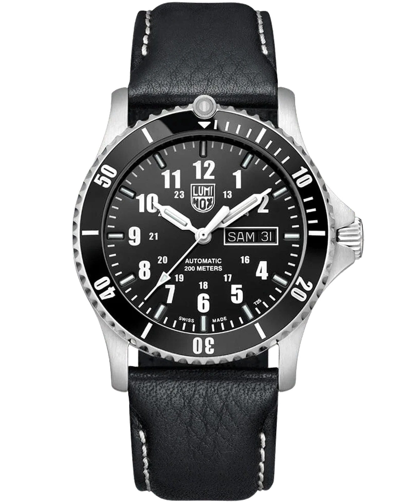 Часы Luminox XS.0921 — истинное воплощение швейцарского качества и современного стиля. Эти мужские часы, оснащённые механизмом с автоподзаводом, предлагают безупречную точность и надёжность, благодаря использованию калибра Sellita SW 220-1 с 26 камнями. Корпус выполнен из высококачественной стали 316L, что придаёт дополнительную прочность и устойчивость к износу. Чёрный циферблат защищён сапфировым стекломСапфировое стеклоПрочный и надёжный материал из кристалла сапфира синтетического происхождения, характеризующийся особой твёрдостью и устойчивостью к царапинам и повреждениям. с антибликовым покрытиемАнтибликовое покрытиеСлой оксида металла в 0,13-0,3 микрон, благодаря которому стекло часов не бликует и не отражает свет. Антибликовое покрытие уменьшает отражение света в 10 раз, обеспечивая отличную читаемость показателей циферблата., что позволяет с лёгкостью считывать показания даже при ярком освещении. Часы обладают функцией отображения даты и дня недели, расположенной в удобном окошке в позиции 3 часа. Вращающийся в одном направлении керамический безельБезельВнешний ободок, закрепляющий стекло. В спортивных часах так называется поворотное кольцо с делениями на циферблате, выполняет роль таймера – замеряет отрезки времени на шкале. Неподвижный безель – элемент декора. Однонаправленно вращающийся безель на дайверских часах позволяет фиксировать моменты погружения и выныривания на поверхность. обеспечивает дополнительную функциональность и стильный вид. Благодаря технологии LLTLLTLLT — это автономный механизм подсветки, основанный на использовании микроскопических газонаполненных элементов. Специальные герметичные капсулы из боросиликатного стекла, интегрированные в циферблат, генерируют свечение без необходимости подключения к внешним источникам энергии. Для их работы не требуется ни дополнительный свет, ни механическое воздействие (например, нажатие кнопки). Свечение возникает благодаря химическому процессу: реакция между тритием, заключенным в капсулах, и люминофорным покрытием создает стабильное автономное освещение. Технология обеспечивает энергетическую независимость и долговечность подсветки.-подсветки, эти часы гарантируют превосходную видимость в темноте на протяжении 25 лет. Завинчивающаяся заводная головка с защитой и прозрачная задняя крышка подчёркивают внимание к деталям и практичность дизайна. Кожаный ремешок на стандартной застёжке обеспечивает надёжную фиксацию на запястье. Водозащита уровня 200WR позволяет использовать часы даже в условиях повышенной влажности. Габаритные размеры составляют 42 мм в диаметре, 13 мм в толщину и весом 95 г делает их идеальным выбором для тех, кто ценит стиль и функциональность в одном аксессуаре.