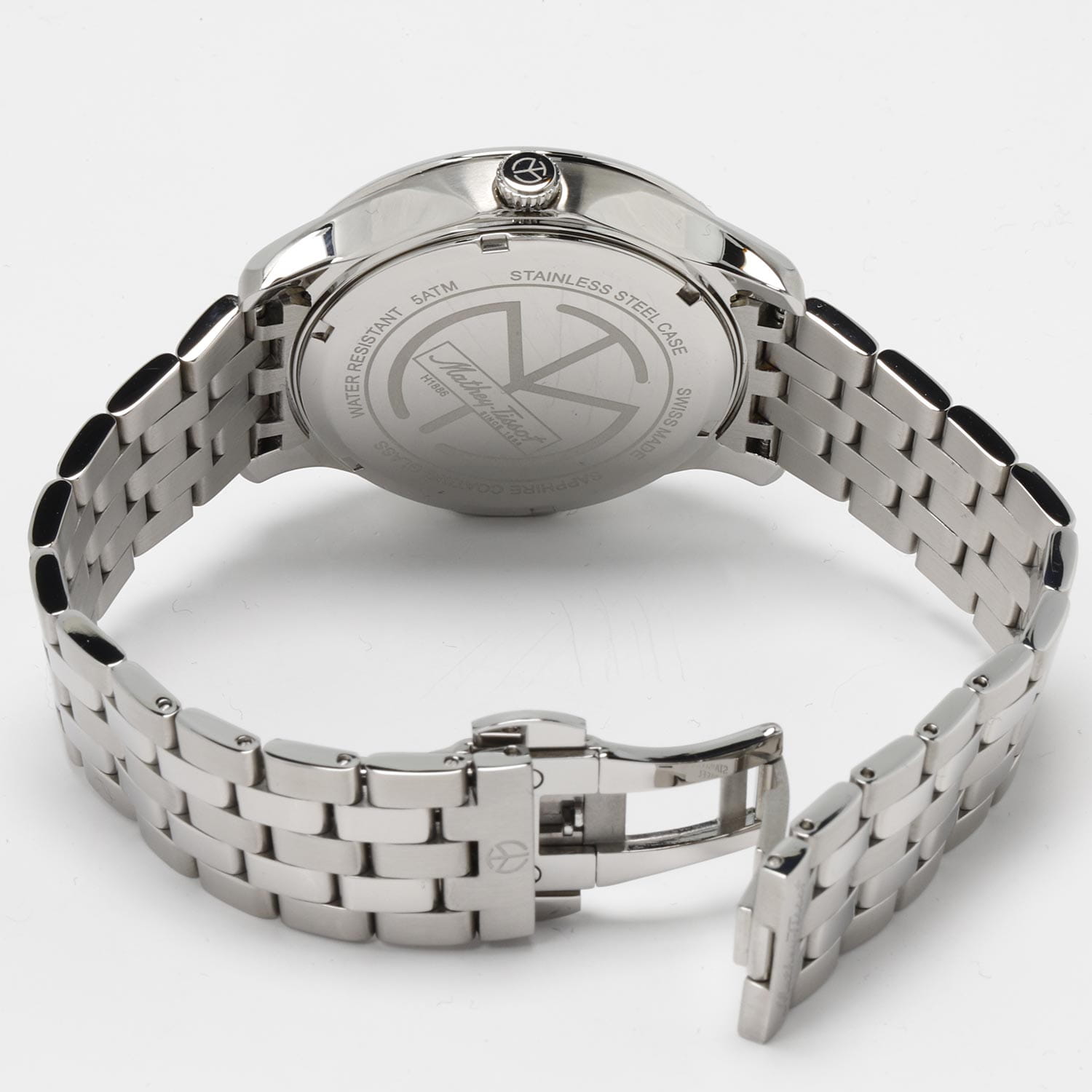 Мужские кварцевые часы Mathey-Tissot Edmond Metal H1886MAN — это стильное сочетание элегантности и современного дизайна. Изящный корпус выполнен из нержавеющей стали, диаметром 42 мм, что придаст образу элегантности и надежности. Изысканный циферблат с метками в виде штрихов и римских цифр придает модели особый блеск. Циферблат защищен минеральным стекломМинеральное стеклоМинеральное стекло представляет собой искусственно выращенный минерал кварца. Такое стекло отличается особой устойчивостью к повреждениям и царапинам. Уступает по некоторым качествам сапфировому стеклу. с сапфировым покрытием, обеспечивает устойчивость к царапинам. Окошко даты находится в положении 12 часов. Стальной браслет на застёжке-бабочке с кнопкамиЗастёжка "бабочка"Такой вид застёжки дополняется предохранителями, помогающими избежать случайного раскрытия браслета. Обладают изящным исполнением. , гарантирует комфортное и безопасное ношение. Секундная стрелка вынесена на отдельный циферблат. Рифленая заводная головка. Класс водозащиты: 50 метров позволит защитить корпус от случайных брызг или капель дождя. Mathey-Tissot — отличный выбор для тех, кто ценит утонченность и качество.