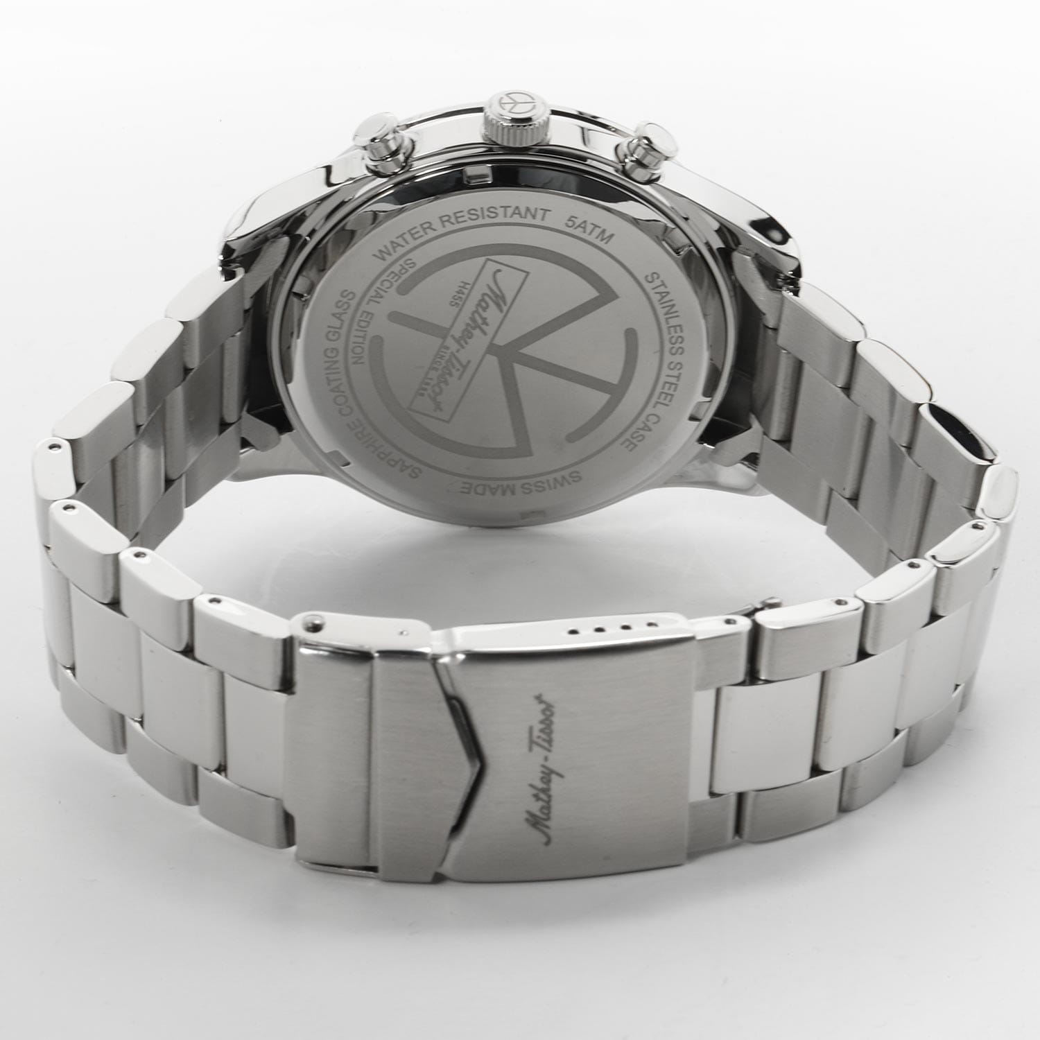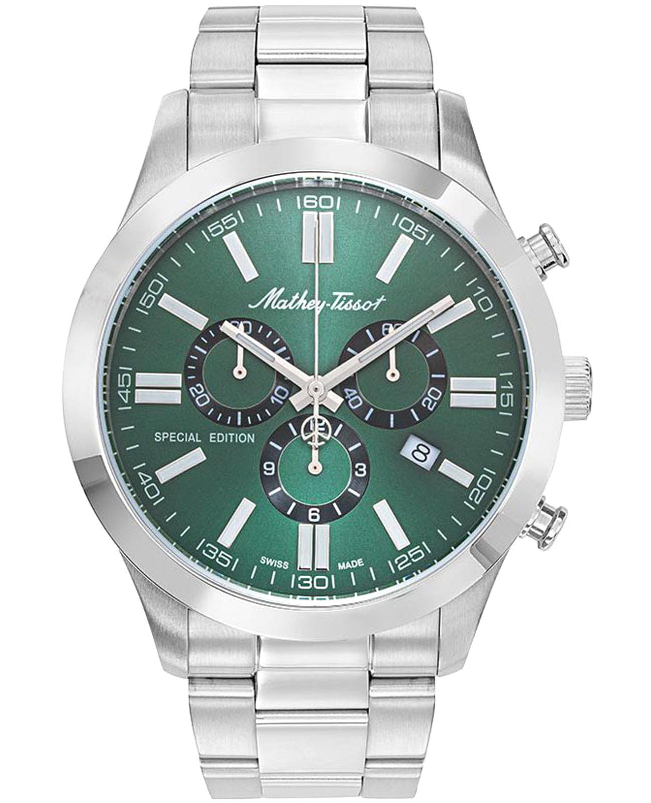 Мужские кварцевые часы-хронографХронографФункция позволяет измерять отрезки времени с особой точностью: часы, минуты, секунды. Верным признаком хронографа является наличие на циферблате 3 дополнительных окошек-счётчиков. с секундомеромСекундомерСекундоме́р — прибор, способный измерять интервалы времени с точностью до долей секунды. Mathey-Tissot Mathy H455CHVE — это стильное сочетание элегантности и современного дизайна. Изящный корпус выполнен из нержавеющей стали, диаметром 44 мм, что придаст образу элегантности и надежности. Изысканный циферблат с метками в виде штрихов придает модели особый блеск. Циферблат защищен минеральным стекломМинеральное стеклоМинеральное стекло представляет собой искусственно выращенный минерал кварца. Такое стекло отличается особой устойчивостью к повреждениям и царапинам. Уступает по некоторым качествам сапфировому стеклу. с сапфировым покрытием, обеспечивает устойчивость к царапинам. Стрелки и метки с люминесцентным покрытиемЛюминесцентное покрытиеПозволяет считывать показания времени в темноте. Производители наносят на стрелки, часовые индексы, безель или поверхность циферблата светонакопительный состав, дающий холодное свечение.. Окошко даты находится в положении 4 часа. Стальной браслет на раскладной застёжке с фиксаторомРаскладная застёжкаТакой тип застёжки используется только на браслетах из металла. Она никогда не раскрывается полностью, происходит разделение на 2 и более частей. Раскладывающая застёжка снизит вероятность потери часов к минимуму., гарантирует комфортное и безопасное ношение. Рифленая заводная головка. Класс водозащиты: 50 метров позволит защитить корпус от случайных брызг или капель дождя. Mathey-Tissot  — отличный выбор для тех, кто ценит утонченность и качество.