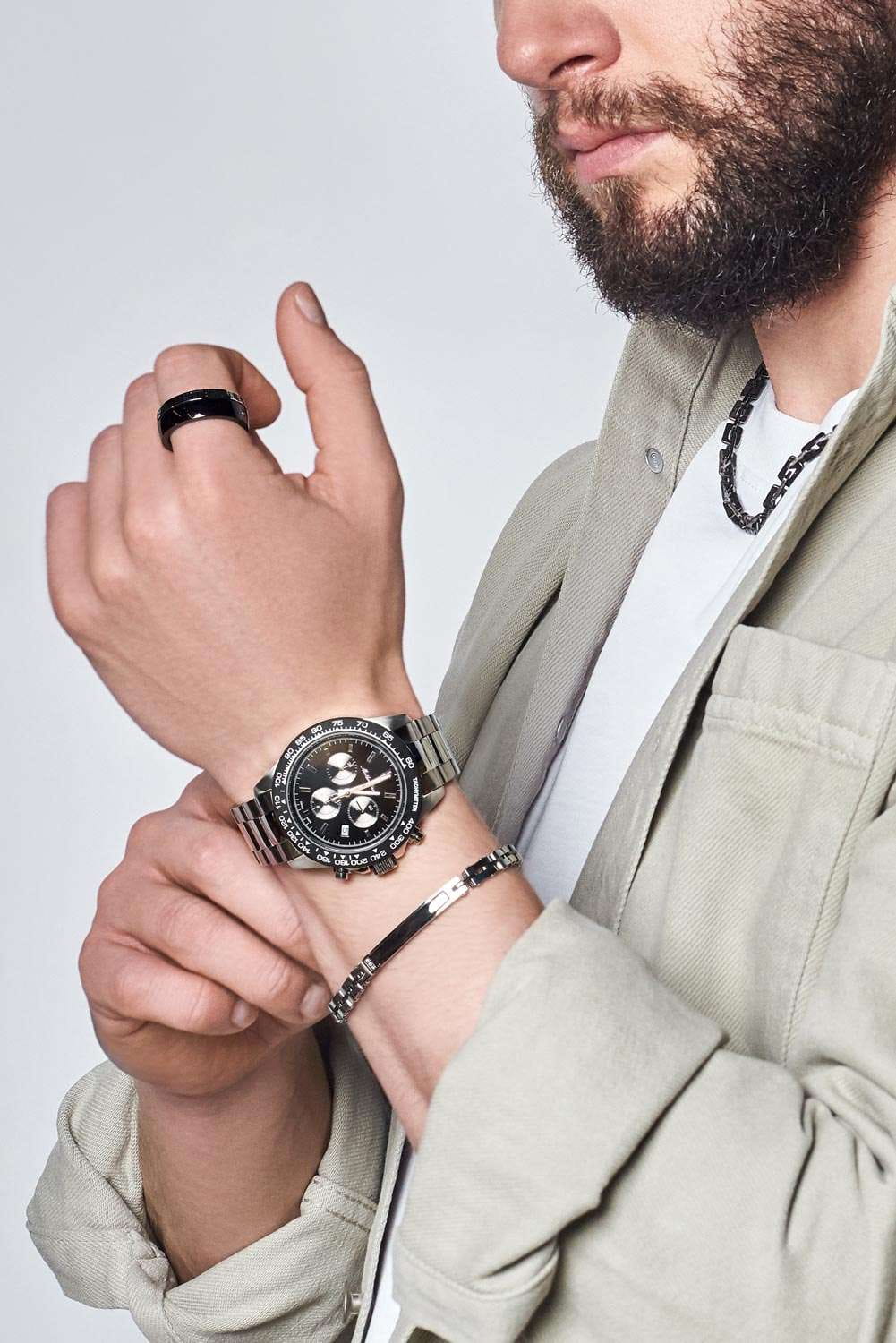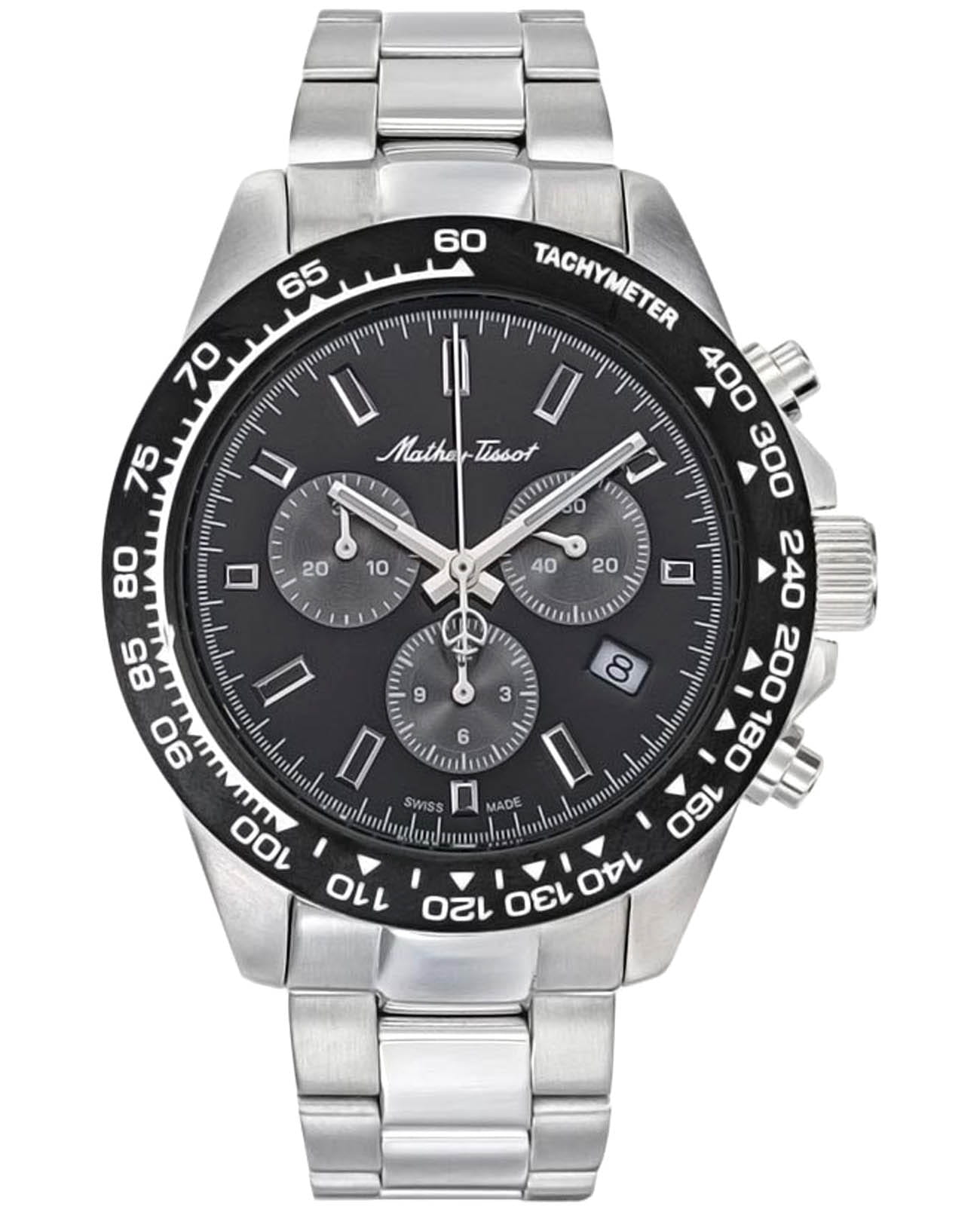 Мужские кварцевые часы-хронографХронографФункция позволяет измерять отрезки времени с особой точностью: часы, минуты, секунды. Верным признаком хронографа является наличие на циферблате 3 дополнительных окошек-счётчиков. с секундомеромСекундомерСекундоме́р — прибор, способный измерять интервалы времени с точностью до долей секунды. Mathey-Tissot Mathy H9010CHAN — это стильное сочетание элегантности и современного дизайна. Изящный корпус выполнен из нержавеющей стали, диаметром 42 мм, что придаст образу элегантности и надежности. Изысканный циферблат с метками в виде штрихов придает модели особый блеск. Циферблат защищен минеральным стекломМинеральное стеклоМинеральное стекло представляет собой искусственно выращенный минерал кварца. Такое стекло отличается особой устойчивостью к повреждениям и царапинам. Уступает по некоторым качествам сапфировому стеклу. с сапфировым покрытием, обеспечивает устойчивость к царапинам. Стрелки и метки с люминесцентным покрытиемЛюминесцентное покрытиеПозволяет считывать показания времени в темноте. Производители наносят на стрелки, часовые индексы, безель или поверхность циферблата светонакопительный состав, дающий холодное свечение.. Окошко даты находится в положении 4 часа. Часы оснащены надежным кварцевым механизмом. На безелеБезельВнешний ободок, закрепляющий стекло. В спортивных часах так называется поворотное кольцо с делениями на циферблате, выполняет роль таймера – замеряет отрезки времени на шкале. Неподвижный безель – элемент декора. Однонаправленно вращающийся безель на дайверских часах позволяет фиксировать моменты погружения и выныривания на поверхность. шкала тахиметраТахиметрРазмеченная шкала, располагается на ободке или безеле часов. Тахиметр позволяет рассчитать скорость на определённом участке пути, расстояние измеряется в километрах или милях..  Стальной браслет на раскладной застёжке с фиксаторомРаскладная застёжкаТакой тип застёжки используется только на браслетах из металла. Она никогда не раскрывается полностью, происходит разделение на 2 и более частей. Раскладывающая застёжка снизит вероятность потери часов к минимуму., гарантирует комфортное и безопасное ношение. Рифленая заводная головка. Класс водозащиты: 50 метров позволит защитить корпус от случайных брызг или капель дождя. Mathey-Tissot  — отличный выбор для тех, кто ценит утонченность и качество.