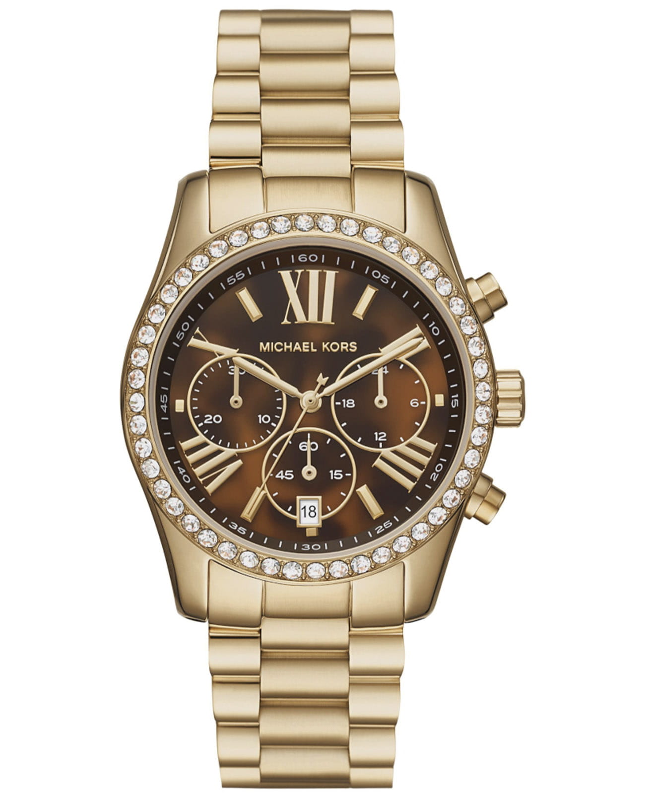 Женские американские наручные часы-хронографХронографФункция позволяет измерять отрезки времени с особой точностью: часы, минуты, секунды. Верным признаком хронографа является наличие на циферблате 3 дополнительных окошек-счётчиков. с секундомеромСекундомерСекундоме́р — прибор, способный измерять интервалы времени с точностью до долей секунды. Michael Kors Lexington MK7276, кварцевый механизм с высокой точностью. Класс водозащиты: 50 метров, позволит защитить корпус от случайных брызг или капель дождя. Корпус часов изготовлен из стали с IP-покрытиемIP-покрытиеМетод ионного напыления. Демонстрирует повышенную устойчивость к истиранию, окислению и химическим веществам. Под воздействием высокого давления и температуры около 1500°C молекулы металла надёжно соединяются с частицами корпуса часов.. Стальной браслет на раскладной застёжкеРаскладная застёжкаТакой тип застёжки используется только на браслетах из металла. Она никогда не раскрывается полностью, происходит разделение на 2 и более частей. Раскладывающая застёжка снизит вероятность потери часов к минимуму. с IP-покрытиемIP-покрытиеМетод ионного напыления. Демонстрирует повышенную устойчивость к истиранию, окислению и химическим веществам. Под воздействием высокого давления и температуры около 1500°C молекулы металла надёжно соединяются с частицами корпуса часов.. БезельБезельВнешний ободок, закрепляющий стекло. В спортивных часах так называется поворотное кольцо с делениями на циферблате, выполняет роль таймера – замеряет отрезки времени на шкале. Неподвижный безель – элемент декора. Однонаправленно вращающийся безель на дайверских часах позволяет фиксировать моменты погружения и выныривания на поверхность. с IP-покрытиемIP-покрытиеМетод ионного напыления. Демонстрирует повышенную устойчивость к истиранию, окислению и химическим веществам. Под воздействием высокого давления и температуры около 1500°C молекулы металла надёжно соединяются с частицами корпуса часов. инкрустирован кристаллами. Окошко даты находится в положении 6 часов.