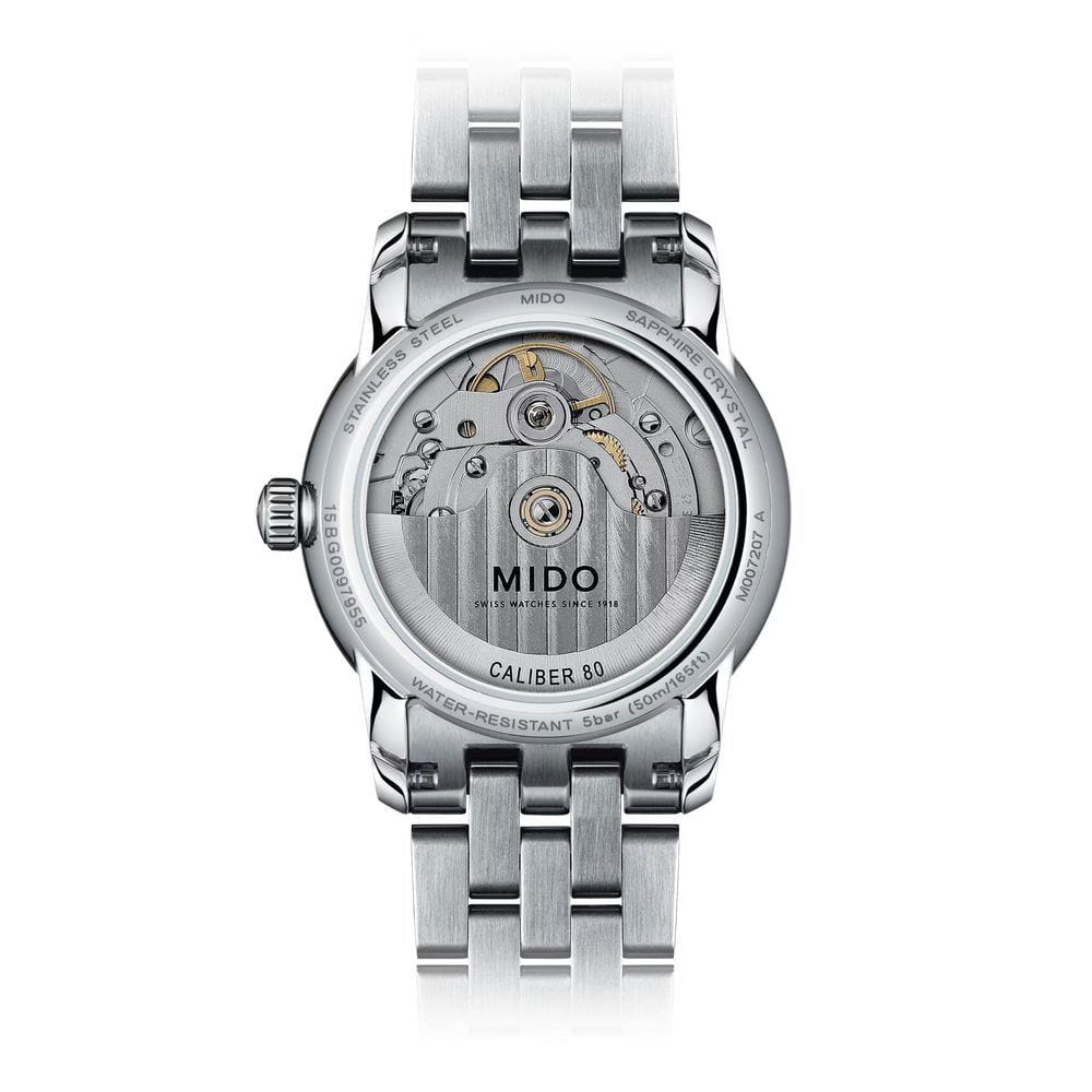 Женские швейцарские механические часы Mido Baroncelli Diamonds M007.207.11.036.00. Механический механизм (автоматический калибр) с высокой точностью. Сапфировое стеклоСапфировое стеклоПрочный и надёжный материал из кристалла сапфира синтетического происхождения, характеризующийся особой твёрдостью и устойчивостью к царапинам и повреждениям. с антибликовым покрытиемАнтибликовое покрытиеСлой оксида металла в 0,13-0,3 микрон, благодаря которому стекло часов не бликует и не отражает свет. Антибликовое покрытие уменьшает отражение света в 10 раз, обеспечивая отличную читаемость показателей циферблата. устойчивое к появлению царапин, обладающее высокой прозрачностью. Корпус выполнен из стали. Прозрачная задняя крышка. Класс водозащиты: 50 метров, позволит защитить корпус от случайных брызг или капель дождя. Стальной браслет на раскладной застёжкеРаскладная застёжкаТакой тип застёжки используется только на браслетах из металла. Она никогда не раскрывается полностью, происходит разделение на 2 и более частей. Раскладывающая застёжка снизит вероятность потери часов к минимуму.. На циферблате 12 бриллиантов общим весом 0,03 карата, окантовывающих окошко даты. Гильошированный циферблат.
