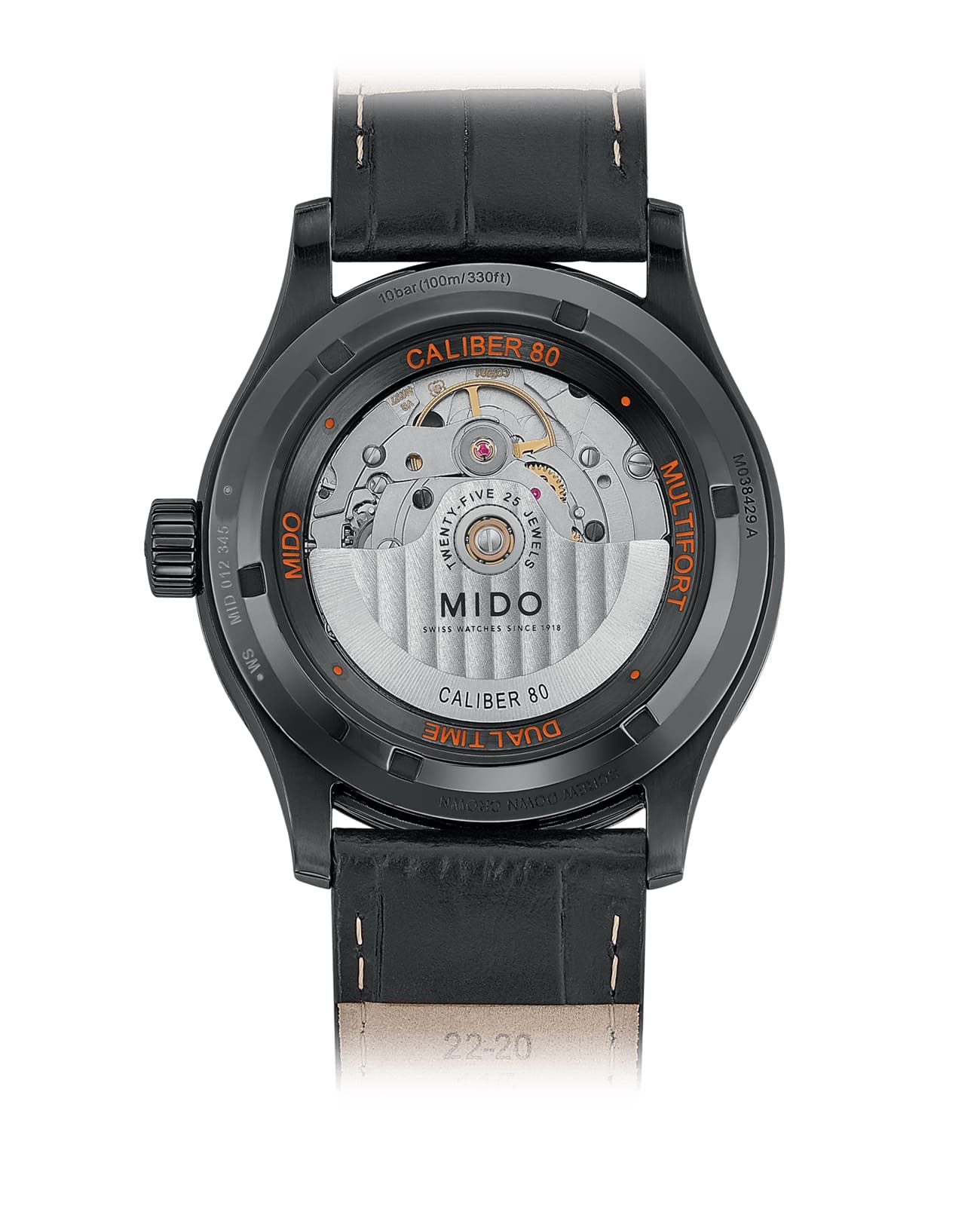 Мужские швейцарские механические часы с функцией второго часового пояса Mido Multifort Dual Time M038.429.36.051.00 оснащена эксклюзивным механизмом Группы Swatch – калибром Calibre 80 с автоматическим подзаводом и функцией GMT, механический механизм (автоматический калибр) с высокой точностью. Сапфировое стекло устойчивое к появлению царапин, обладающее высокой прозрачностью. Класс водозащиты: 100 метров, позволит плавать, нырять и заниматься другими водными видами спорта. Корпус часов изготовлен из стали, с PVD покрытием черного цвета. Сохранив верность фирменному стилю коллекции Multifort, мастера переосмыслили в современном ключе ее эстетические коды: так, новые часы украшает более широкий декор «Женевские полосы», придающий дизайну лаконичность и улучшающий считываемость показаний.