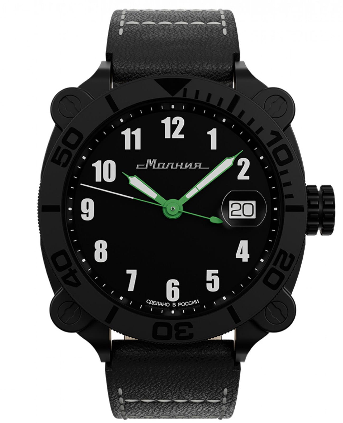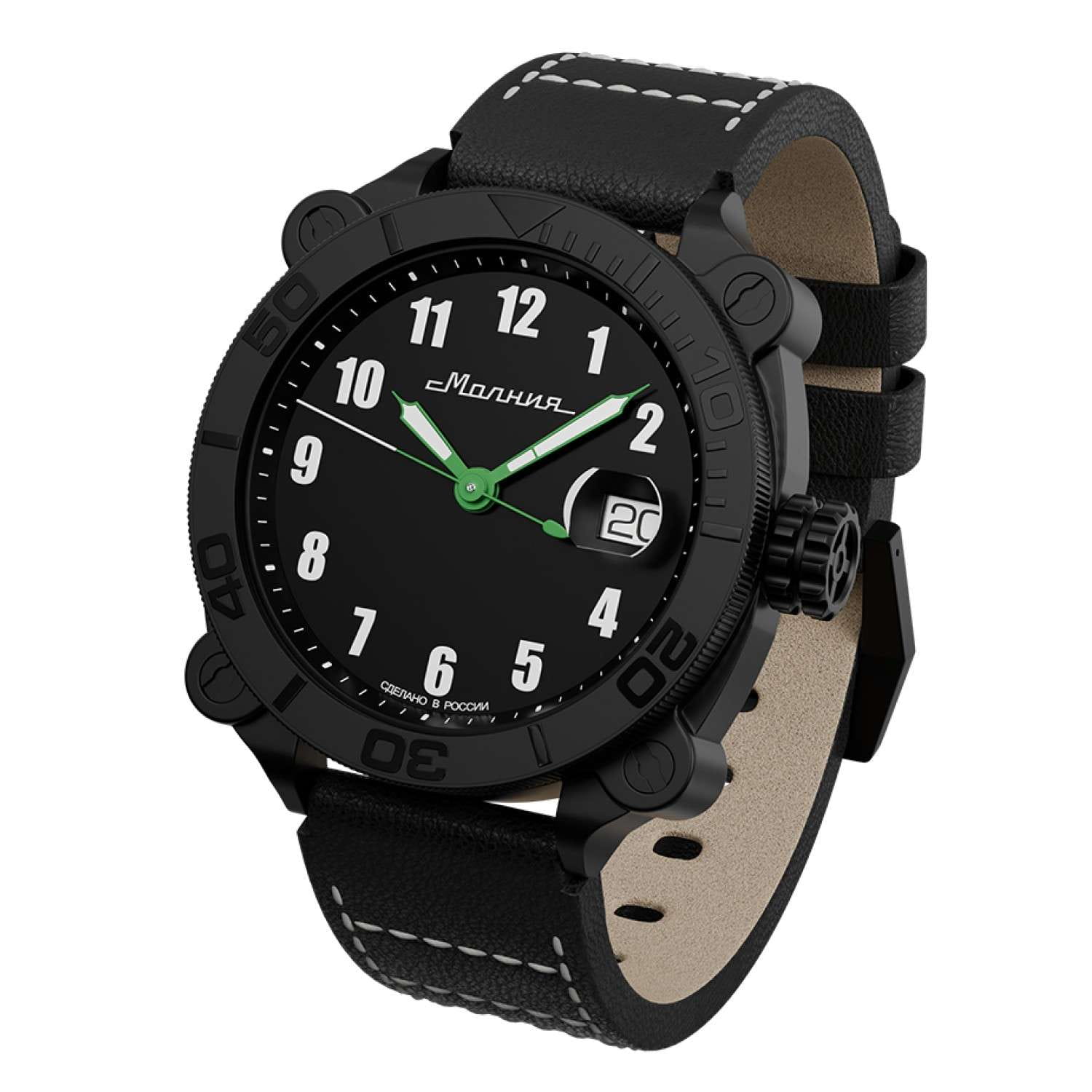 Мужские механические часы с автоподзаводом от бренда «МОЛНИЯ» — это стильный аксессуар, вдохновлённый дизайном приборной панели легендарного танка Т-72. Корпус диаметром 42 мм и толщиной 12 мм выполнен из нержавеющей стали 316L с IP-покрытиемIP-покрытиеМетод ионного напыления. Демонстрирует повышенную устойчивость к истиранию, окислению и химическим веществам. Под воздействием высокого давления и температуры около 1500°C молекулы металла надёжно соединяются с частицами корпуса часов.. БезельБезельВнешний ободок, закрепляющий стекло. В спортивных часах так называется поворотное кольцо с делениями на циферблате, выполняет роль таймера – замеряет отрезки времени на шкале. Неподвижный безель – элемент декора. Однонаправленно вращающийся безель на дайверских часах позволяет фиксировать моменты погружения и выныривания на поверхность. однонаправленный, вращающийся. Циферблат чёрного цвета оформлен арабскими цифрами и логотипом бренда. Окошко даты расположено в положении 3 часов и оснащено увеличительным стеклом. Стрелки и метки с люминесцентным покрытиемЛюминесцентное покрытиеПозволяет считывать показания времени в темноте. Производители наносят на стрелки, часовые индексы, безель или поверхность циферблата светонакопительный состав, дающий холодное свечение. Super-LumiNova. Циферблат защищён сапфировым стекломСапфировое стеклоПрочный и надёжный материал из кристалла сапфира синтетического происхождения, характеризующийся особой твёрдостью и устойчивостью к царапинам и повреждениям. с антибликовым покрытиемАнтибликовое покрытиеСлой оксида металла в 0,13-0,3 микрон, благодаря которому стекло часов не бликует и не отражает свет. Антибликовое покрытие уменьшает отражение света в 10 раз, обеспечивая отличную читаемость показателей циферблата.. Механизм — Русский автоматический калибр Восток 2416 запас хода до 42 часов. Заводная головка стилизована под гусеничную ленту, задняя крышка с гравировкой танка. Часы оснащены кожаным ремешком чёрного цвета с классической пряжкой и системой быстрой замены. Водонепроницаемость 100 м позволяет использовать часы для плавания и повседневного ношения. Идеальный выбор для тех, кто ценит инженерное наследие и мощный дизайн.