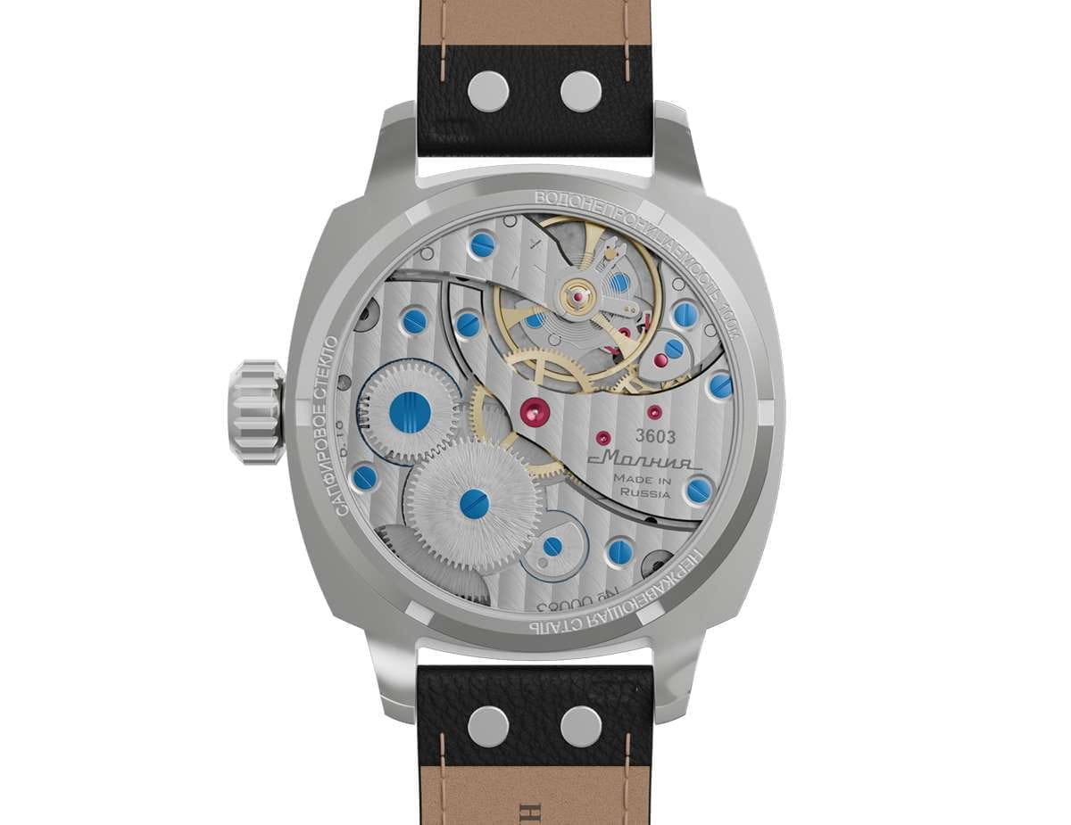 Мужские механические часы с ручным подзаводом — это аксессуар от легендарного бренда «МОЛНИЯ», созданный на Челябинском часовом заводе. Корпус диаметром 42 мм выполнен из нержавеющей стали 316L с зеркальной полировкой. БезельБезельВнешний ободок, закрепляющий стекло. В спортивных часах так называется поворотное кольцо с делениями на циферблате, выполняет роль таймера – замеряет отрезки времени на шкале. Неподвижный безель – элемент декора. Однонаправленно вращающийся безель на дайверских часах позволяет фиксировать моменты погружения и выныривания на поверхность. также выполнен из стали с зеркальной отделкой. Циферблат чёрного цвета оформлен индексами и стрелками. Малая секундная стрелка вынесена на позицию 9 часов. Стрелки и метки с люминесцентным покрытиемЛюминесцентное покрытиеПозволяет считывать показания времени в темноте. Производители наносят на стрелки, часовые индексы, безель или поверхность циферблата светонакопительный состав, дающий холодное свечение. Super-LumiNova, обеспечивающим хорошую читаемость в темноте. Циферблат защищён сапфировым стекломСапфировое стеклоПрочный и надёжный материал из кристалла сапфира синтетического происхождения, характеризующийся особой твёрдостью и устойчивостью к царапинам и повреждениям. с антибликовым покрытиемАнтибликовое покрытиеСлой оксида металла в 0,13-0,3 микрон, благодаря которому стекло часов не бликует и не отражает свет. Антибликовое покрытие уменьшает отражение света в 10 раз, обеспечивая отличную читаемость показателей циферблата.. Механизм — мануфактурный калибр 3603, собранный вручную, с запасом хода до 40 часов. Прозрачная задняя крышка позволяет наблюдать за работой механизма. Часы оснащены кожаным ремешком чёрного цвета с белой отстрочкой и классической пряжкой. Водонепроницаемость 100 м позволяет использовать часы для плавания и повседневного ношения. Идеальный выбор для тех, кто ценит российское качество и традиции.