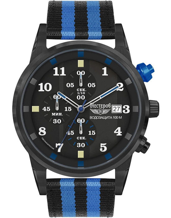 Ремешок выполнен из прочного нейлона в чёрно-синей цветовой гамме, обеспечивая комфорт при носке и добавляя модели спортивный характер. Толщина корпуса составляет 10 мм, что придаёт часам солидный вид.