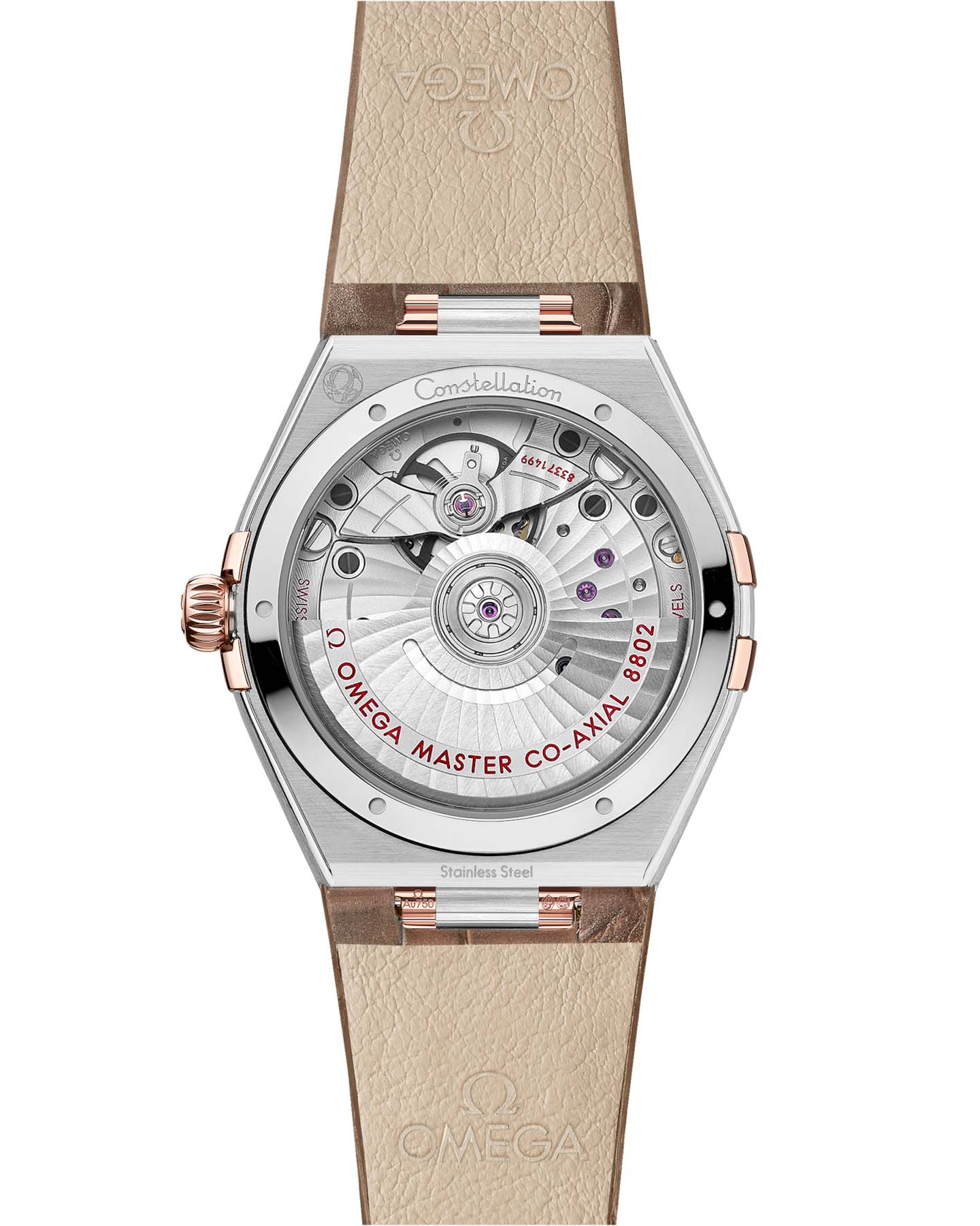 Sedna™, а малый секундный циферблат и центральная минутная дорожка обведены кольцами. Часы, представленные на кожаном ремешке сиренево-коричневого цвета, приводятся в движение коаксиальным хронометром OMEGA Master Chronometer Calibre 8802, который виден через куполообразное сапфировое стеклоСапфировое стеклоПрочный и надёжный материал из кристалла сапфира синтетического происхождения, характеризующийся особой твёрдостью и устойчивостью к царапинам и повреждениям., устойчивое к царапинам.