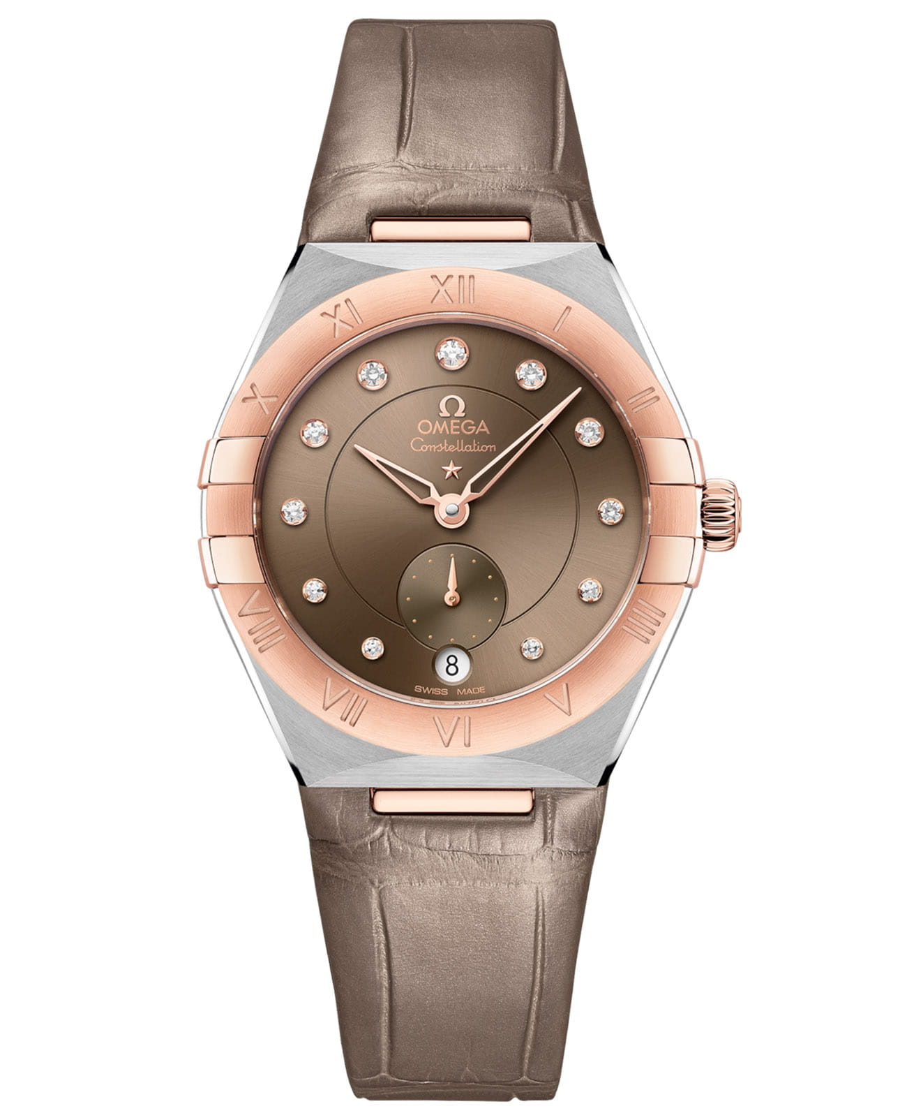 Sedna™ и нержавеющей стали оснащена безелемБезельВнешний ободок, закрепляющий стекло. В спортивных часах так называется поворотное кольцо с делениями на циферблате, выполняет роль таймера – замеряет отрезки времени на шкале. Неподвижный безель – элемент декора. Однонаправленно вращающийся безель на дайверских часах позволяет фиксировать моменты погружения и выныривания на поверхность. с выгравированными римскими цифрами, светло-каштановым циферблатом и круглым окошком даты в положении «6 часов». Инкрементные бриллиантовые часовые индексы представлены в держателях из золота 18K18-каратное золотоОбозначение по каратной системе пробирования, оно показывает, сколько драгоценного металла содержится в изделии. 18 карат - в составе 75% чистого золота, соответствует 750 пробе.