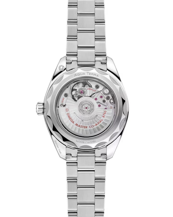 Часы Omega Seamaster Aqua Terra выполнены в симметричном корпусе из нержавеющей стали с завинчивающейся задней крышкой, украшенной волновым узором. Циферблат чёрного цвета дополнен окошком даты на 6 часах и 11 индексами в форме корпусов парусников. Стрелки переработанной формы выполнены из 18K белого золота и оснащены люминесцентным покрытиемЛюминесцентное покрытиеПозволяет считывать показания времени в темноте. Производители наносят на стрелки, часовые индексы, безель или поверхность циферблата светонакопительный состав, дающий холодное свечение. Super-LumiNova для лучшей читаемости в темноте. Калибр Omega 8750 сертифицирован как Master Chronometer — гарантия высочайшей точности и устойчивости к магнитным полям. Запас хода составляет 48 часов. Защиту циферблата обеспечивает сапфировое стеклоСапфировое стеклоПрочный и надёжный материал из кристалла сапфира синтетического происхождения, характеризующийся особой твёрдостью и устойчивостью к царапинам и повреждениям. с антибликовым покрытиемАнтибликовое покрытиеСлой оксида металла в 0,13-0,3 микрон, благодаря которому стекло часов не бликует и не отражает свет. Антибликовое покрытие уменьшает отражение света в 10 раз, обеспечивая отличную читаемость показателей циферблата. с обеих сторон. Водозащита позволяет использовать часы в воде без риска повреждения. Диаметр корпуса — 30 мм, между "ушками" — 14 мм, толщина — 10.6 мм, общая длина между "ушками" — 36.5 мм. Часы установлены на интегрированный стальной браслет с закруглёнными звеньями и застёжкой-бабочкой с кнопкамиЗастёжка "бабочка"Такой вид застёжки дополняется предохранителями, помогающими избежать случайного раскрытия браслета. Обладают изящным исполнением. , обеспечивающим комфорт при ношении. Вес модели — около 81 грамма. Это сочетание премиального качества, технологичности и классического дизайна.