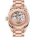 Omega Seamaster Aqua Terra выполнены в симметричном корпусе из полированного 18K Sedna™ золота с завинчивающейся задней крышкой, украшенной волновым узором. Циферблат дополнен окошком даты на 6 часах, окаймлённым кольцом из 18K Sedna™ золота. Стрелки и метки выполнены из 18K Sedna™ золота и оснащены люминесцентным покрытиемЛюминесцентное покрытиеПозволяет считывать показания времени в темноте. Производители наносят на стрелки, часовые индексы, безель или поверхность циферблата светонакопительный состав, дающий холодное свечение. Super-LumiNova для лучшей читаемости в темноте. Индексы выполнены в форме корпусов парусников — деталь, подчёркивающая морское наследие коллекции. Калибр Omega 8801 сертифицирован как Master Chronometer — гарантия высочайшей точности и устойчивости к магнитным полям. Запас хода составляет 55 часов. Защиту циферблата обеспечивает сапфировое стеклоСапфировое стеклоПрочный и надёжный материал из кристалла сапфира синтетического происхождения, характеризующийся особой твёрдостью и устойчивостью к царапинам и повреждениям. с антибликовым покрытиемАнтибликовое покрытиеСлой оксида металла в 0,13-0,3 микрон, благодаря которому стекло часов не бликует и не отражает свет. Антибликовое покрытие уменьшает отражение света в 10 раз, обеспечивая отличную читаемость показателей циферблата. с обеих сторон. Водозащита позволяет использовать часы в воде без риска повреждения. Часы установлены на браслет из 18K Sedna™ золота с раскладной застёжкойРаскладная застёжкаТакой тип застёжки используется только на браслетах из металла. Она никогда не раскрывается полностью, происходит разделение на 2 и более частей. Раскладывающая застёжка снизит вероятность потери часов к минимуму.. Это сочетание премиального качества, технологичности и классического дизайна.