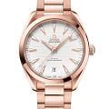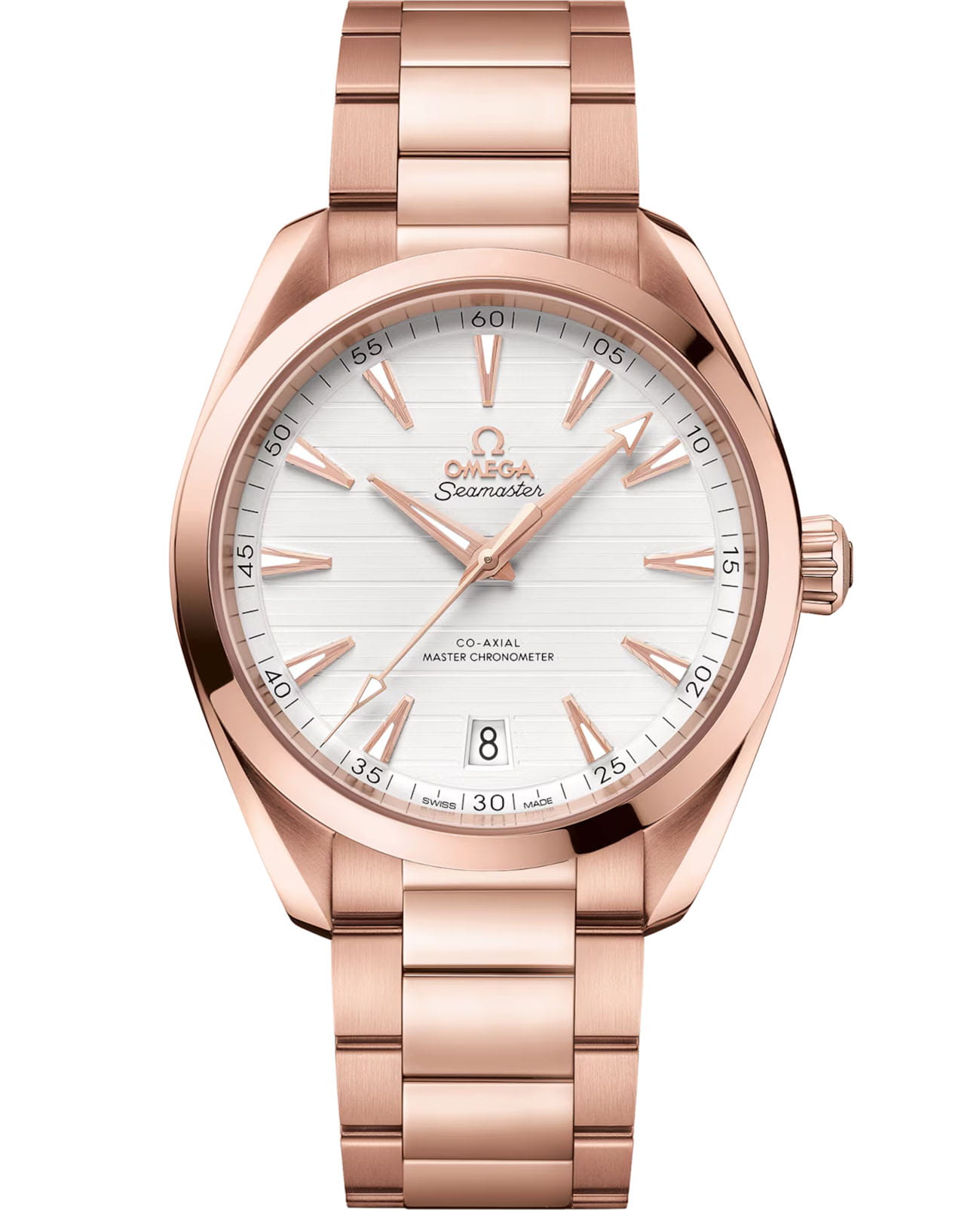 Omega Seamaster Aqua Terra выполнены в симметричном корпусе из 18-каратного золота Sedna™ с завинчивающейся задней крышкой, украшенным волнистым узором. Циферблат дополнил окошком даты на 6 часов и оформил горизонтальный цветок, вдохновлённой текстурой тикового дерева на палубе яхты. Стрелки и метки оснащены Super-LumiNova для лучшей читаемости в темноте. Механизм Калибр Omega 8901 сертифицирован как Master Chronometer — гарантия высочайшей точности и устойчивости к магнитным полям. Запас хода составляет 60 часов. Защита циферблата обеспечивается сапфировое стеклоСапфировое стеклоПрочный и надёжный материал из кристалла сапфира синтетического происхождения, характеризующийся особой твёрдостью и устойчивостью к царапинам и повреждениям. с антибликовым покрытиемАнтибликовое покрытиеСлой оксида металла в 0,13-0,3 микрон, благодаря которому стекло часов не бликует и не отражает свет. Антибликовое покрытие уменьшает отражение света в 10 раз, обеспечивая отличную читаемость показателей циферблата.. Водозащита Позволяет использовать водные часы без повреждений. Часы установлены на браслете из 18-каратного золота с . Это сочетание премиального качества, технологичности и классического дизайна.