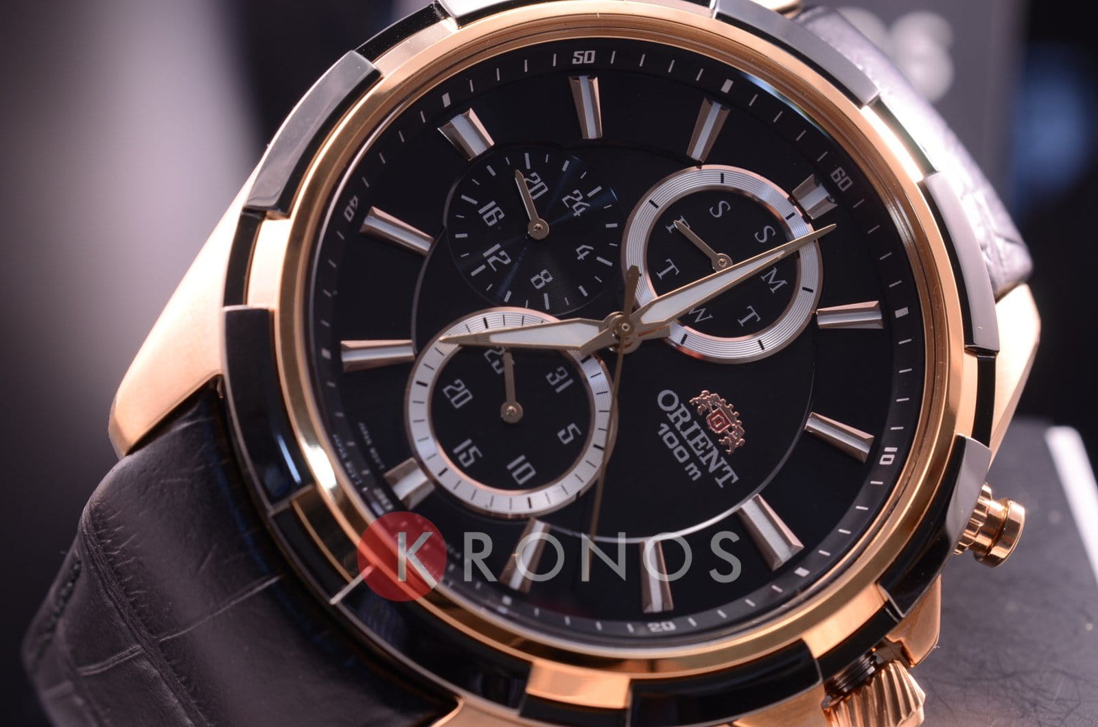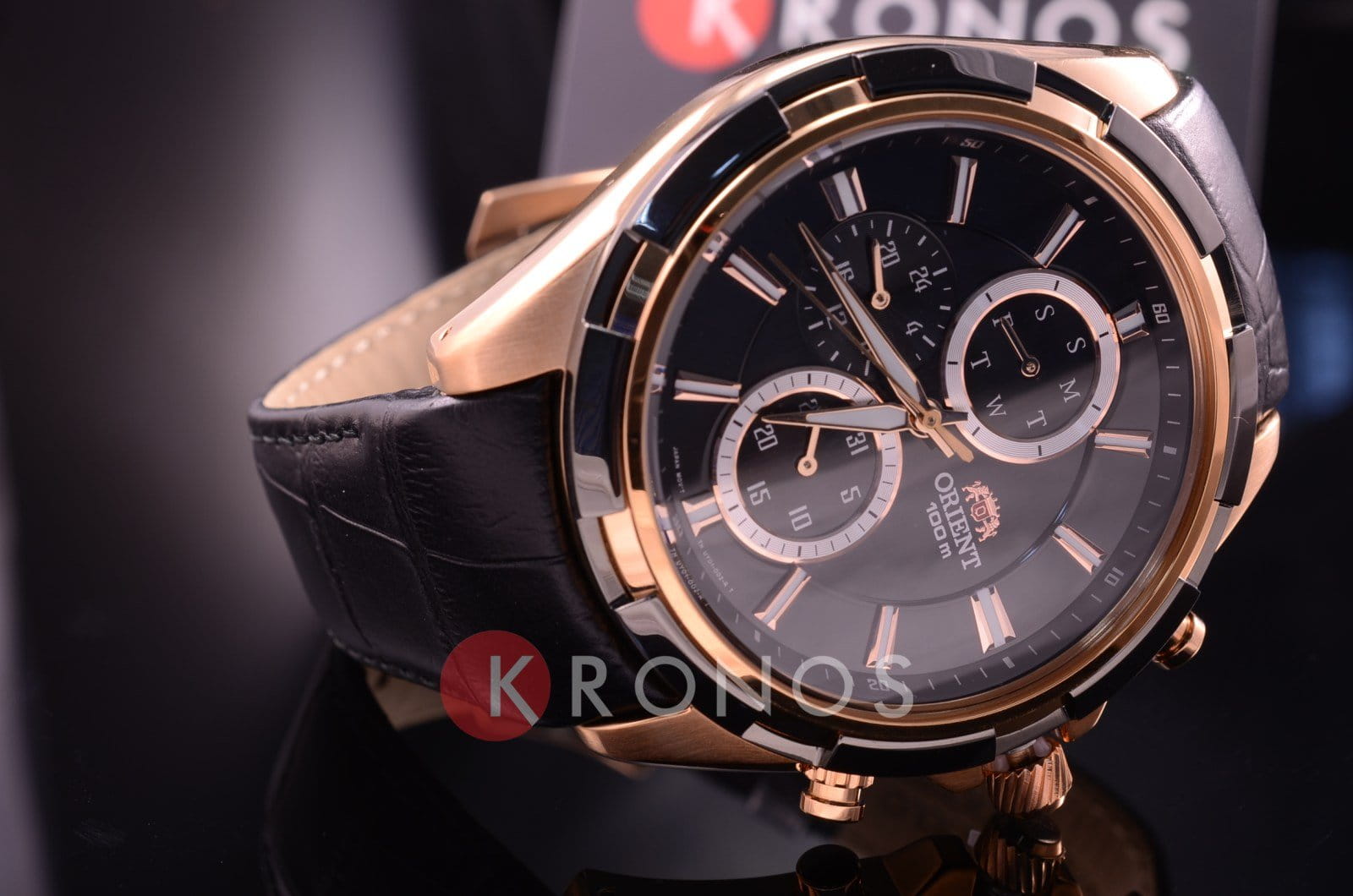 Корпусе из нержавеющей стали, с черным циферблатом и классическим кожаным ремешком Часовые метки в виде крупных белых арабских цифр, дополнительный циферблат хронографа на 30 минут и удобное окошко даты