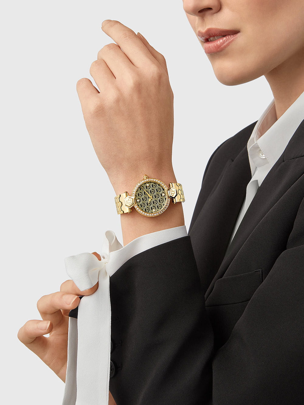 Яркие женские часы Philipp Plein Plein Couture PWEAA0721, кварцевый механизм с высокой точностью. Класс водозащиты: 30 метров, позволит защитить корпус от случайных брызг или капель дождя. Корпус часов изготовлен из стали, золотистого цвета.