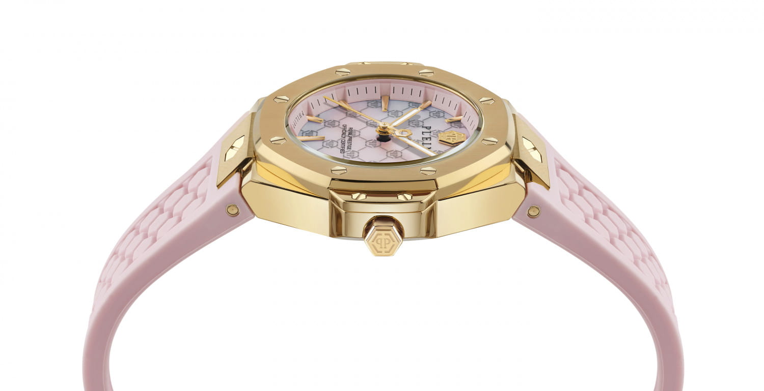 Женские кварцевые часы Philipp Plein Plein Royal Prestige PW4FA0225 — это стильное сочетание элегантности и современного дизайна. Изящный корпус выполнен из нержавеющей стали с PVD-покрытиемPVDУльтратонкое покрытие наносится в технике вакуумного напыления, сочетает в себе нитрид титана особой прочности со слоем золота или оксида хрома. Несёт в себе декоративную или защитную функцию. золотистого цвета, диаметром 33 мм, что придаст образу женственности и романтизма. Изысканный циферблат с метками в виде штрихов придает модели особый блеск. Циферблат защищен минеральным стекломМинеральное стеклоМинеральное стекло представляет собой искусственно выращенный минерал кварца. Такое стекло отличается особой устойчивостью к повреждениям и царапинам. Уступает по некоторым качествам сапфировому стеклу., обеспечивающий устойчивость к царапинам. Стрелки с люминесцентным покрытиемЛюминесцентное покрытиеПозволяет считывать показания времени в темноте. Производители наносят на стрелки, часовые индексы, безель или поверхность циферблата светонакопительный состав, дающий холодное свечение.. Часы оснащены надежным кварцевым механизмом. Силиконовый ремешок на стандартной застёжке, гарантирует комфортное и безопасное ношение. Класс водозащиты: 50 метров позволит защитить корпус от случайных брызг или капель дождя. Phlipp Plein — отличный выбор для тех, кто ценит яркость и качество.